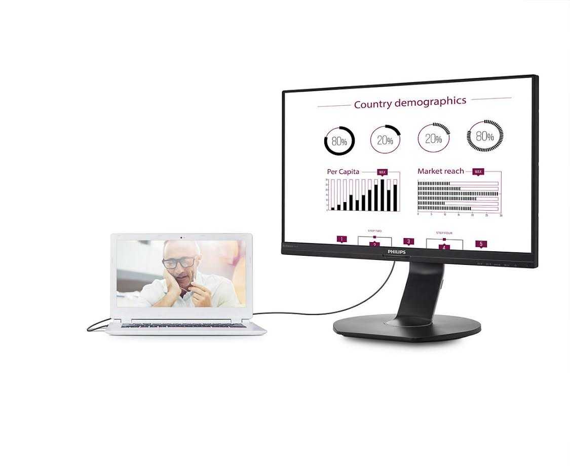 Ноутбук — хороший универсальный инструмент, но полноценно работать на маленьком экране не всегда удобно. Если сотрудники пользуются графическими приложениями, обрабатывают видео, считают в больших таблицах или открывают несколько окон сразу, без полноценного монитора не обойтись. Philips 241B7QUPEB — это одновременно и дисплей, и док-станция для мобильного компьютера с подключением через один-единственный «шнурок» USB-C. Мышь, наушники, внешние накопители, Ethernet-кабель — для всего этого предусмотрены разъемы на корпусе монитора. Одно движение — и мобильное рабочее место превращается в стационарное: с большим 24-дюймовым экраном с разрешением Full HD, точной цветопередачей и технологиями, снижающими нагрузку на глаза.