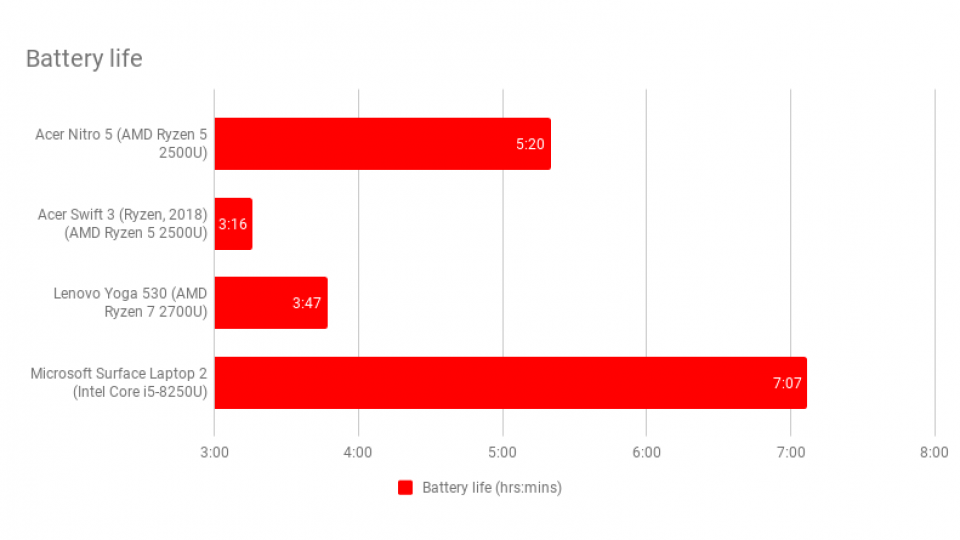 Однако, если у Acer Nitro 5 есть одна экономия, это срок службы батареи. В нашем тесте по воспроизведению видео Nitro 5 продержался 5 часов и 21 минуту, прежде чем нуждался в перезарядке, что является довольно хорошим результатом для игрового ноутбука. Тем не менее, ноутбук Surface 2 продолжал работать почти на 2 часа дольше в тех же условиях.