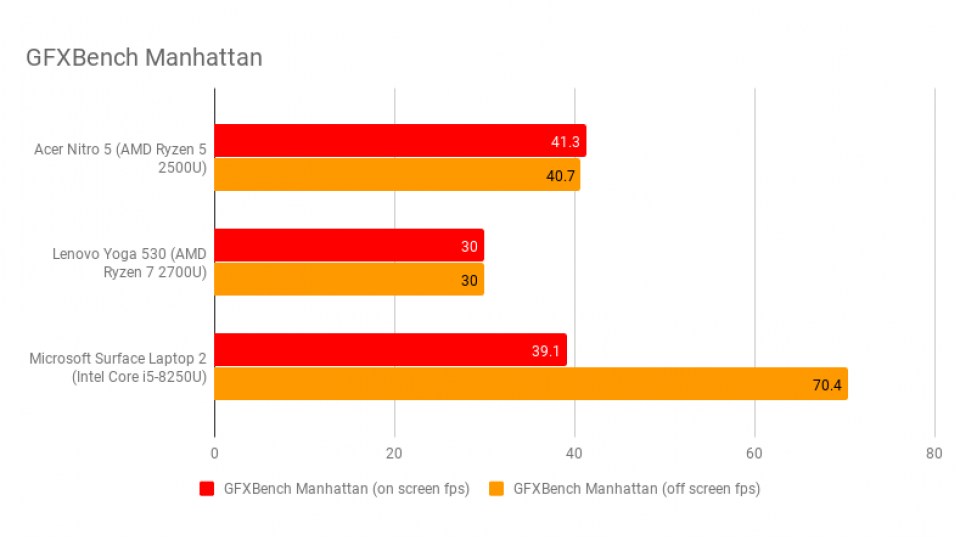 Результаты Nitro 5 GFXBench даже не лучше, чем у неигровых ноутбуков. Ноутбук Surface 2 фактически соответствовал результату GFXBench Manhattan на Nitro 5 со скоростью 41 кадр / с. Если стандартные ноутбуки могут идти в ногу с Nitro 5, то, возможно, это вовсе не игровой ноутбук.