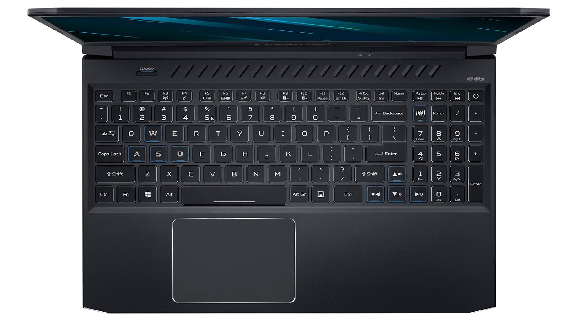 Вокруг лежащей в углублении клавиатуры Acer Predator Helios 300 очень много неиспользуемого пространства. Отдельных макроклавиш нет, механические переключатели отсутствуют, единственные геймерские элементы дизайна — это красные клавиши WASD и подсветка такого же цвета. Подсветка клавиатуры тут не регулируется, её можно только включать или выключать.