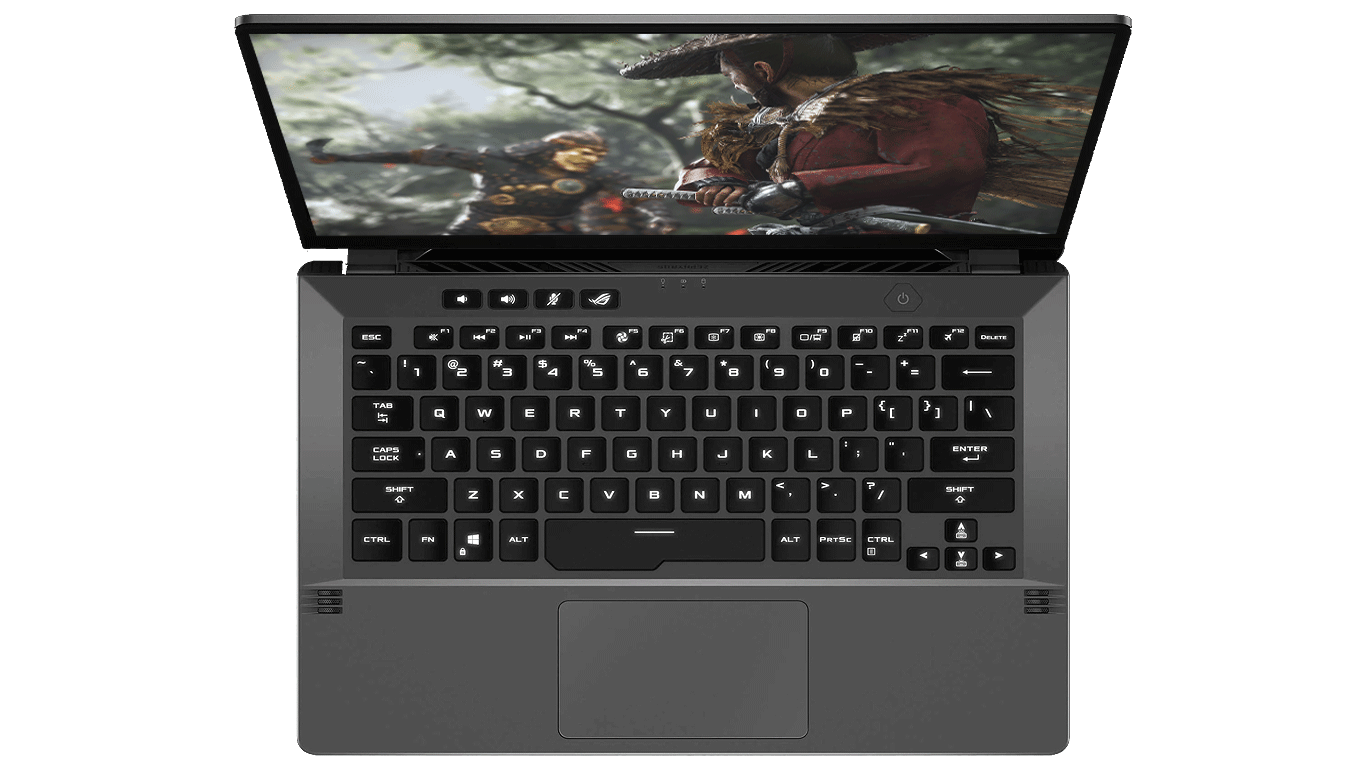 Клавиатура у G14 на самом деле очень похожа на клавиатуру другого ноутбука от ASUS c индексом GX502, мы видим большие полноразмерныке клавиши с хорошо разнесенными стрелками курсорами в правой нижней части клавиатурного блока. Обратная связь в целом не плохая, нажатия четкие и тихие. Есть горячие клавиши для быстрой настройки громкости, отключения микрофона и запуска приложения ROG Armoury Crate. Кроме того, Asus ROG Zephyrus G14 это первая модель в серии ROG, которая обладает встроенным в кнопку включения сканером отпечатков пальцев Чего не хватает ноутбуку так это реализации RGB-подсветки, поскольку Asus решила использовать только белые светодиоды, поэтому подсветка однотонная. Если для черной версии ноутбука белая подсветка, как то оправдывает себя, то для ноутбука в дизайне Mirage (белый) однотонная подсветка на основе белых светодиодов приводит к тому, что разобрать где какой символ порой сложно. Покрытие тач-пада очень скользкое, перемещение курсора, тем не менее, точное и отзывчивое. Встроенные клавиши нажимаются слишком мягко, щелчок при срабатывании неинформативный, а обратная связь практически не ощущается.