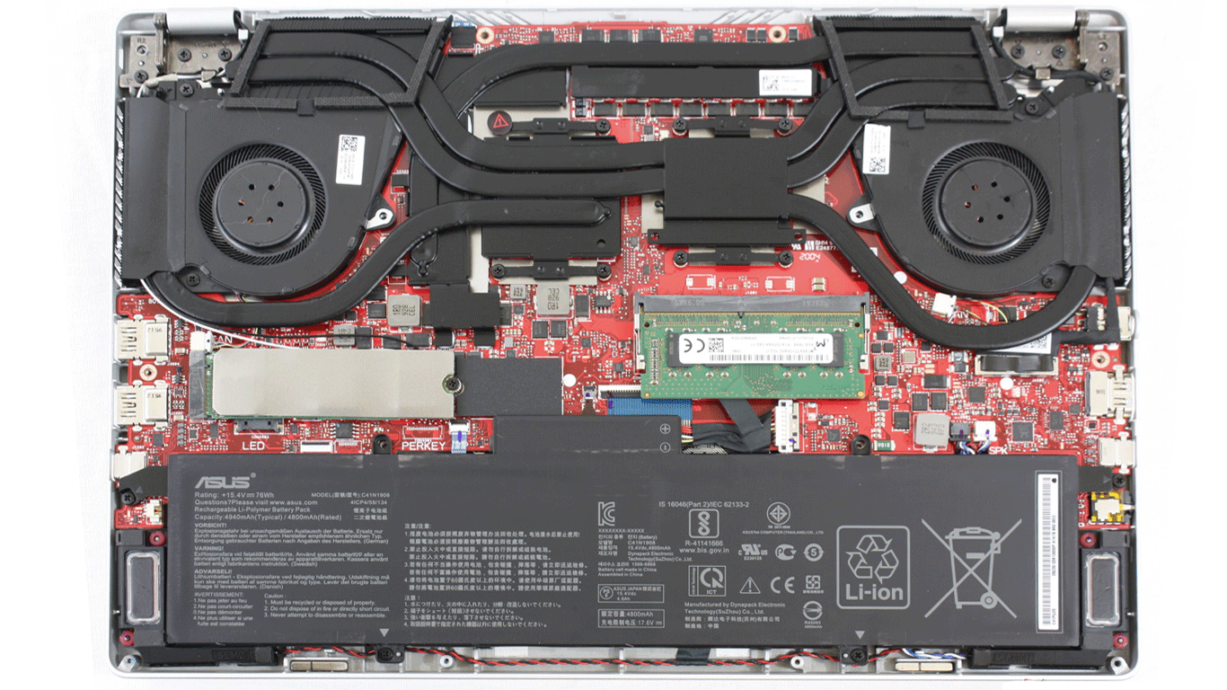 Нижняя крышка ноутбука удерживается 14 стандартными винтами, снимается она довольно легко. Внутри пользователю доступен 1 слот оперативной памяти, M.2 SSD, батарея и Wi-Fi адаптер, который расположился под накопителем. Система охлаждения доступна полностью и поддается обслуживанию.