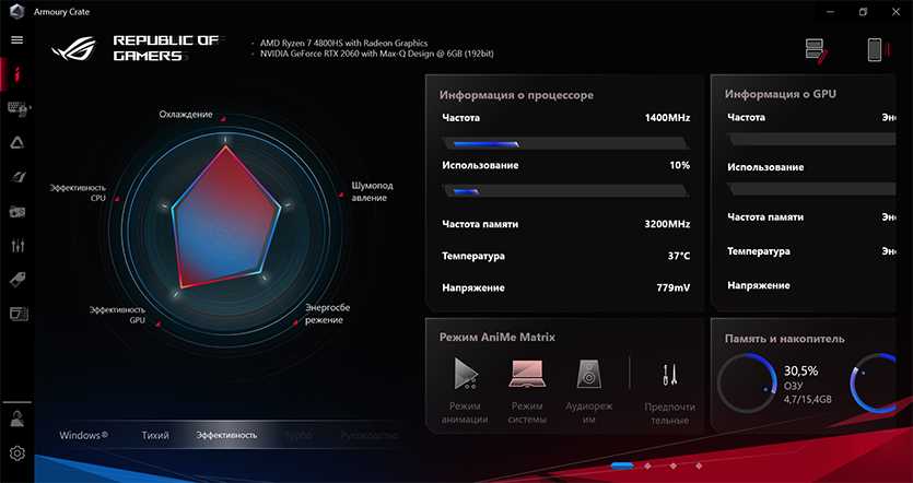 При этом на ScreenPad Plus можно работать руками или с помощью стилуса. Вместе с ноутбуком Republic of Gamers предлагает использовать программу Armoury Crate, с помощью которой можно настраивать и создавать профили отображения приложений на дополнительном экране. Так не придется тратить время на их расстановку при следующем запуске. Также в Armoury Crate можно контролировать производительность, регулировать подсветку, отключать клавиатуру и много чего еще.