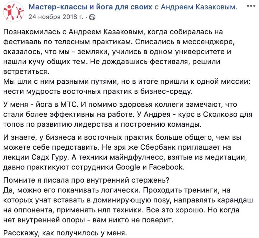 «Мне стала приходить оплата за мастер-классы от людей, которые даже не записались на них. Оплаты происходят без прямых продаж и напоминаний. На регулярные занятия йогой тоже стали прибывать люди. В итоге я открыла третью точку для занятий йогой в Москве», — говорит Анна Стремилова.