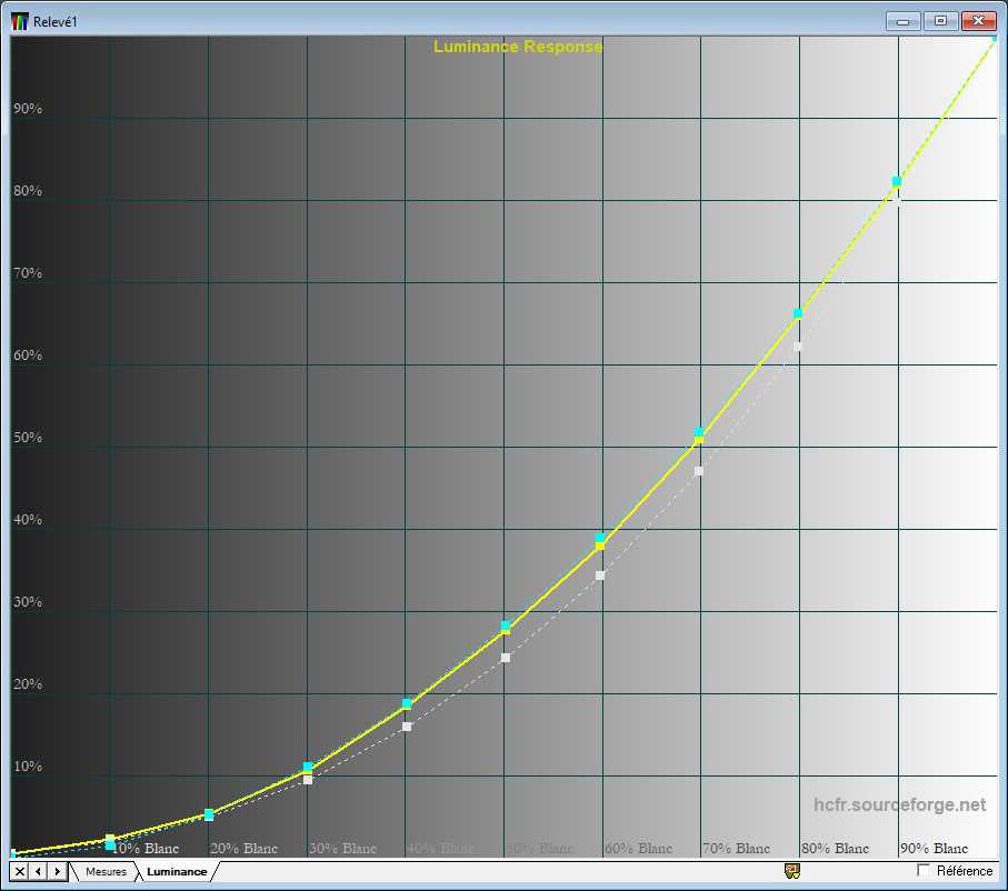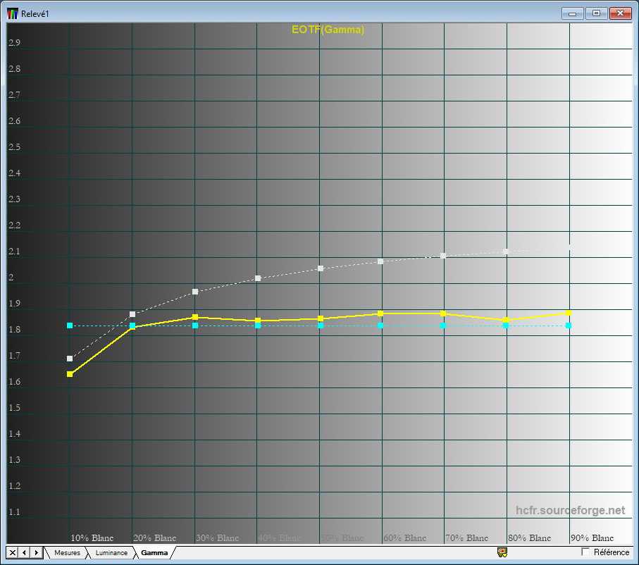 Кривая яркости дисплея немного круче эталонной, средняя гамма заметно ниже 2, примерно на уровне 1,85.