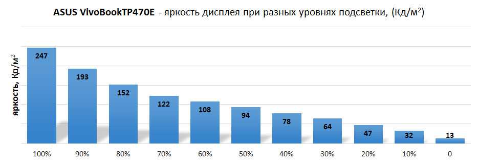 Яркость у дисплея, конечно, откровенно небольшая: среднее значение едва дотягивает до заявленного – 247 Кд/м2. Этого будет достаточно только для работы в помещении.