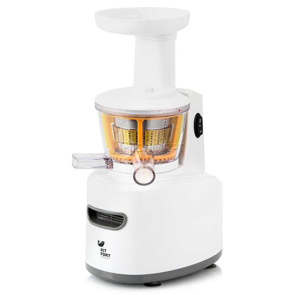 - Kitfort KT-1101. Шнековая модель с мощностью 150 Вт с автоматическим выбросом жмыха. Компактный прибор быстро и легко очищается.