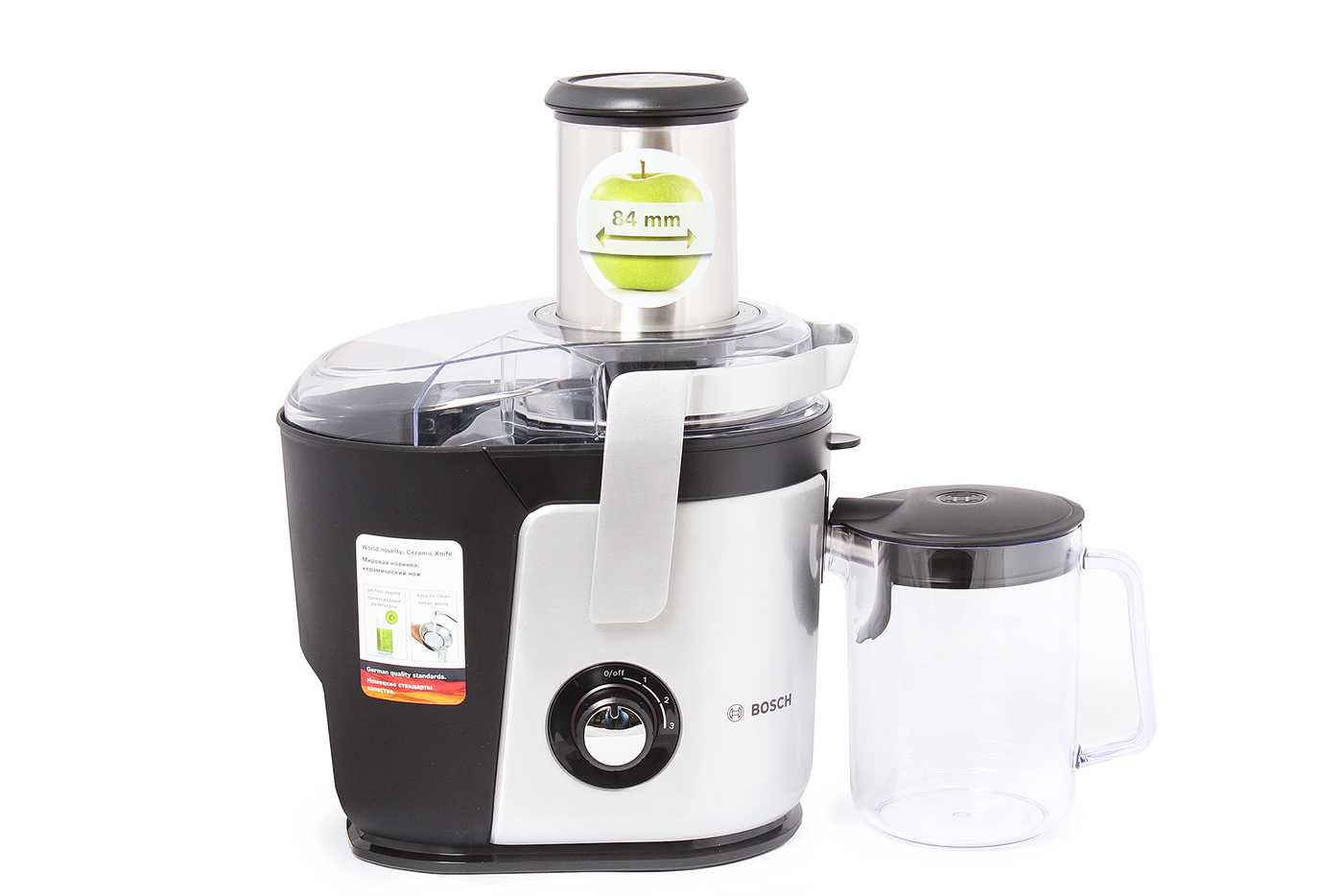 - Bosch MES 4010. Мощность 1200 Вт, 3-скоростной режим работы. Наличие системы «капля-стоп», большого резервуара для выброса жмыха.