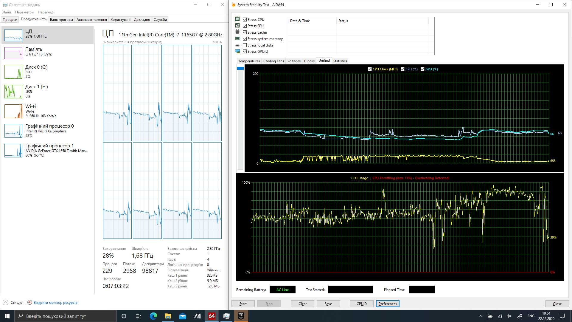 По нагреву. За пол-часа стресс-теста AIDA64 с нагрузкой на процессор и видеоядро Xe, но без нагрузки на GTX 1650 Ti, система почти сразу словила троттлинг и частоты процессора сбросились до минимальных — AIDA показывала 200 МГц, диспетчер задач — 600.