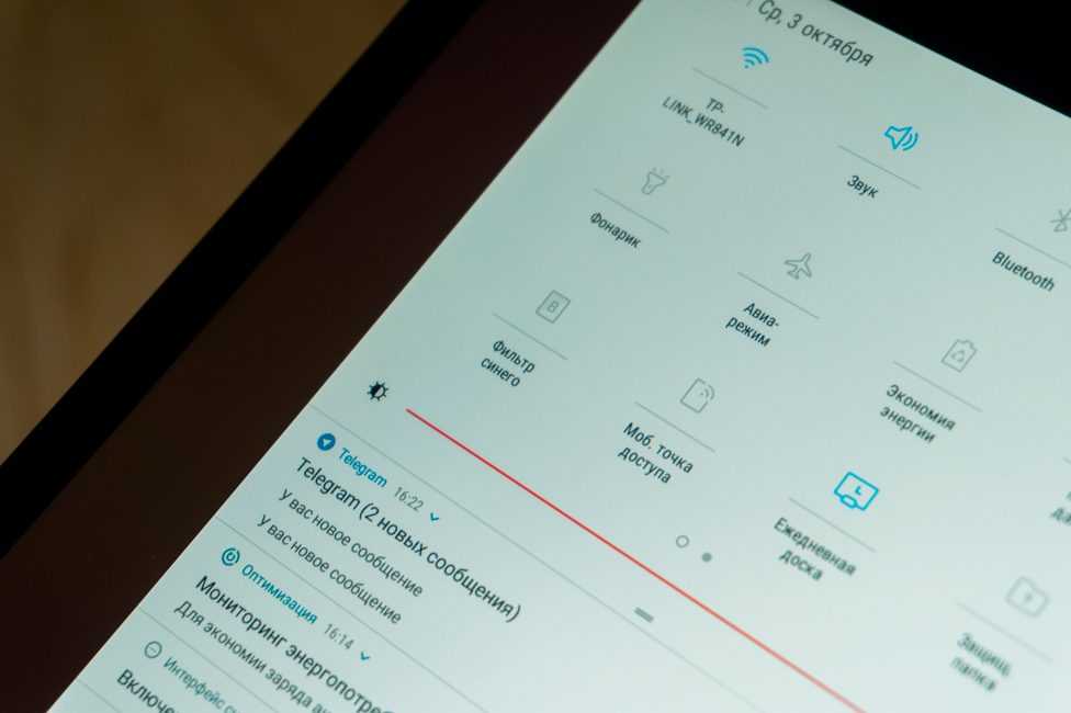В планшете есть авторегулировка яркости — она работает нормально. Из других дополнительных функций есть только фильтр синего для уменьшения напряжения на глаза, но и он активируется из шторки с переключателями — отрегулировать его уровень невозможно.