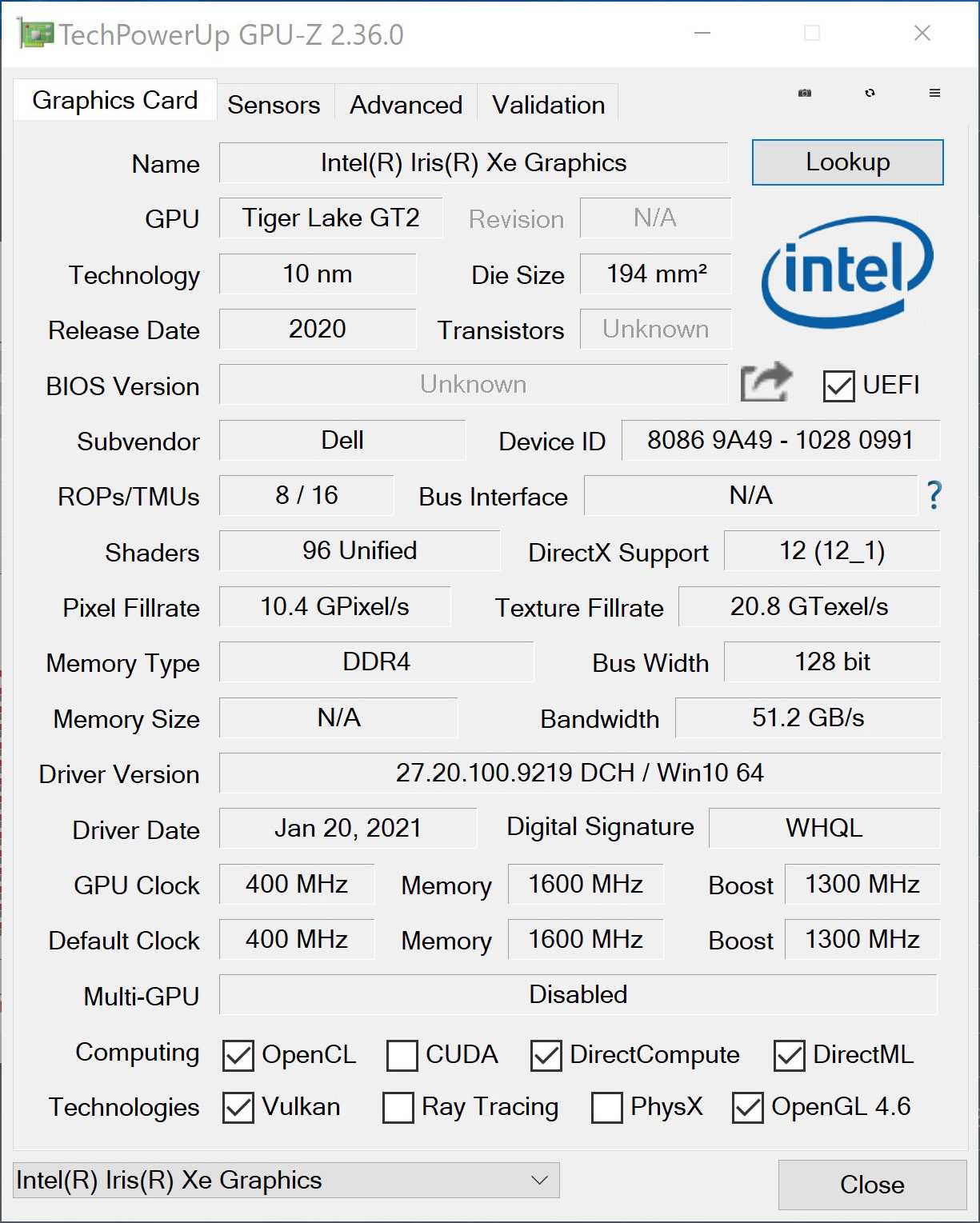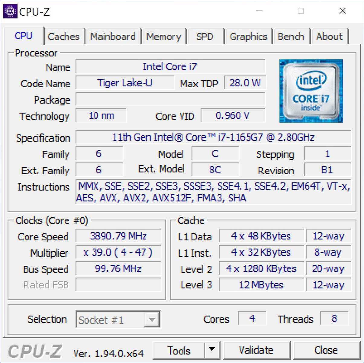 Как мы уже отметили вначале, главным обновлением Dell XPS 13 9310 стал новый процессор Intel 11-го поколения. Это Intel Core i7-1165G7, в нашей версии — 6390R73 (встречаются и младшие модели Intel Core i3-1115G4 и Core i5-1135G7), который относится к энергоэффективным чипам семейства Tiger Lake U. Процессор имеет 4 ядра и 8 потоков, а также интегрированную графику Intel Xe. Каждое ядро работает на частоте 2.8 -4.7 ГГц при нагрузке на одно ядро, а максимальная частота при нагрузке на все ядра не поднимется выше 4.1 ГГц. Кэш-память 3 уровня общая с графическим ядром и составляет 12 МБ. Процессор обладает динамическим TDP 12-28 Вт, что в данной модели как раз и будет выгодным – позволит избегать перегрева, а также повысит общую автономность.