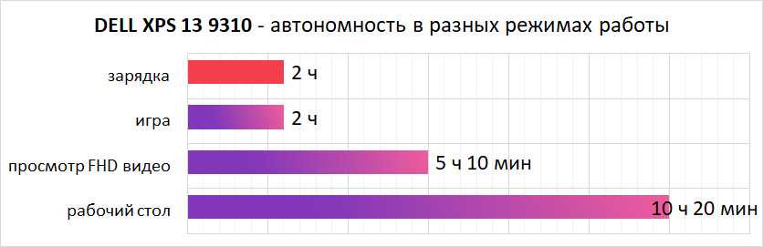 По автономности ультрабук не ставит рекордов, но время работы неплохое. При просмотре видео FHD его хватит больше, чем на 5 часов, а при лёгких нагрузках вроде текстового редактора или веб-серфинга – до 10 часов. Яркость экрана при замерах была на уровне 50%. Результаты примерно похожие на предыдущую модель XPS 13 9300, но стоит учитывать, что эти цифры получены на конфигурации с 4K-дисплеем с повышенной яркостью (до 471 Кд/м2 по нашим тестам).