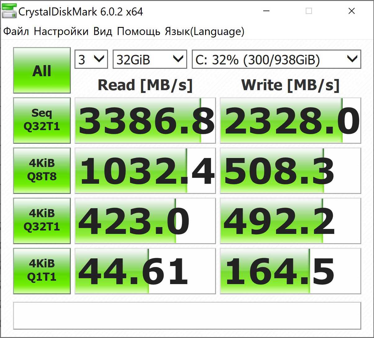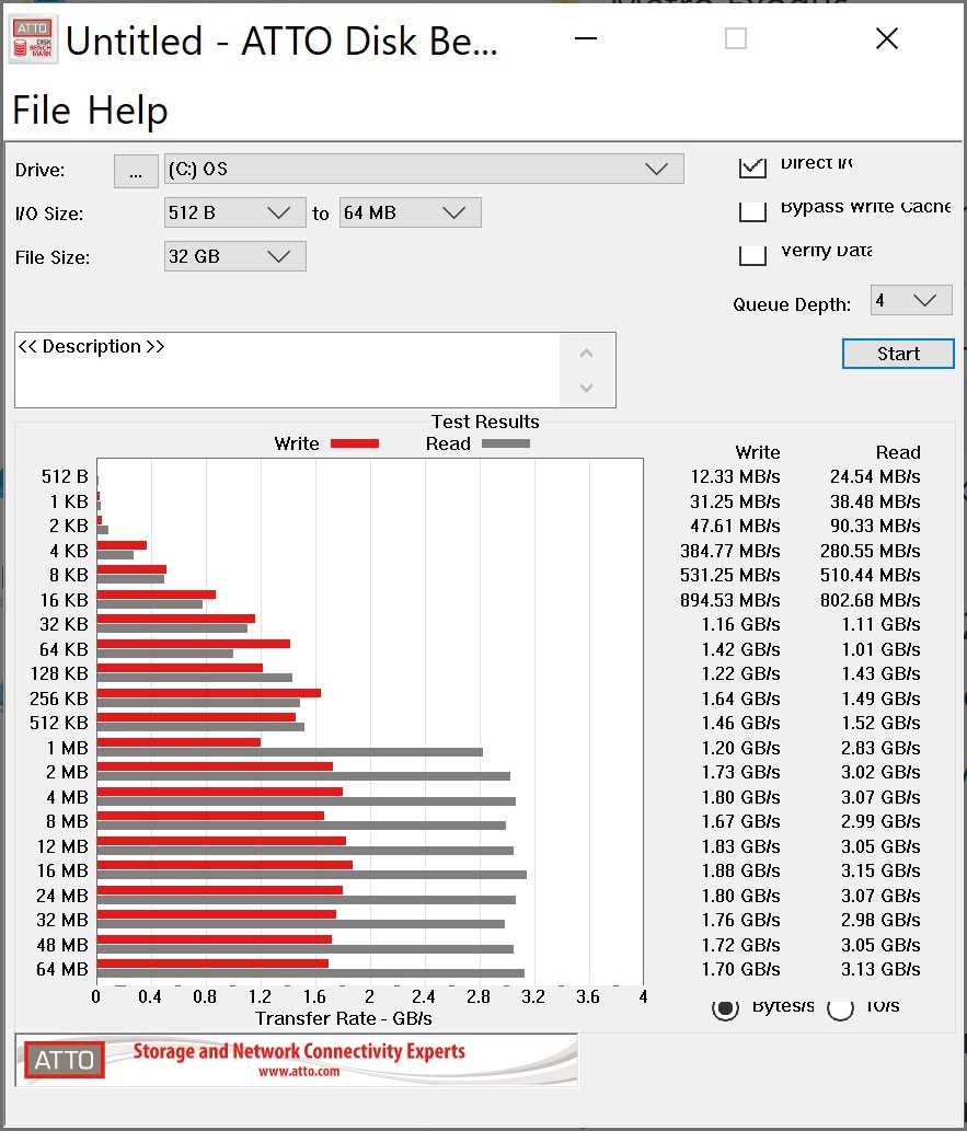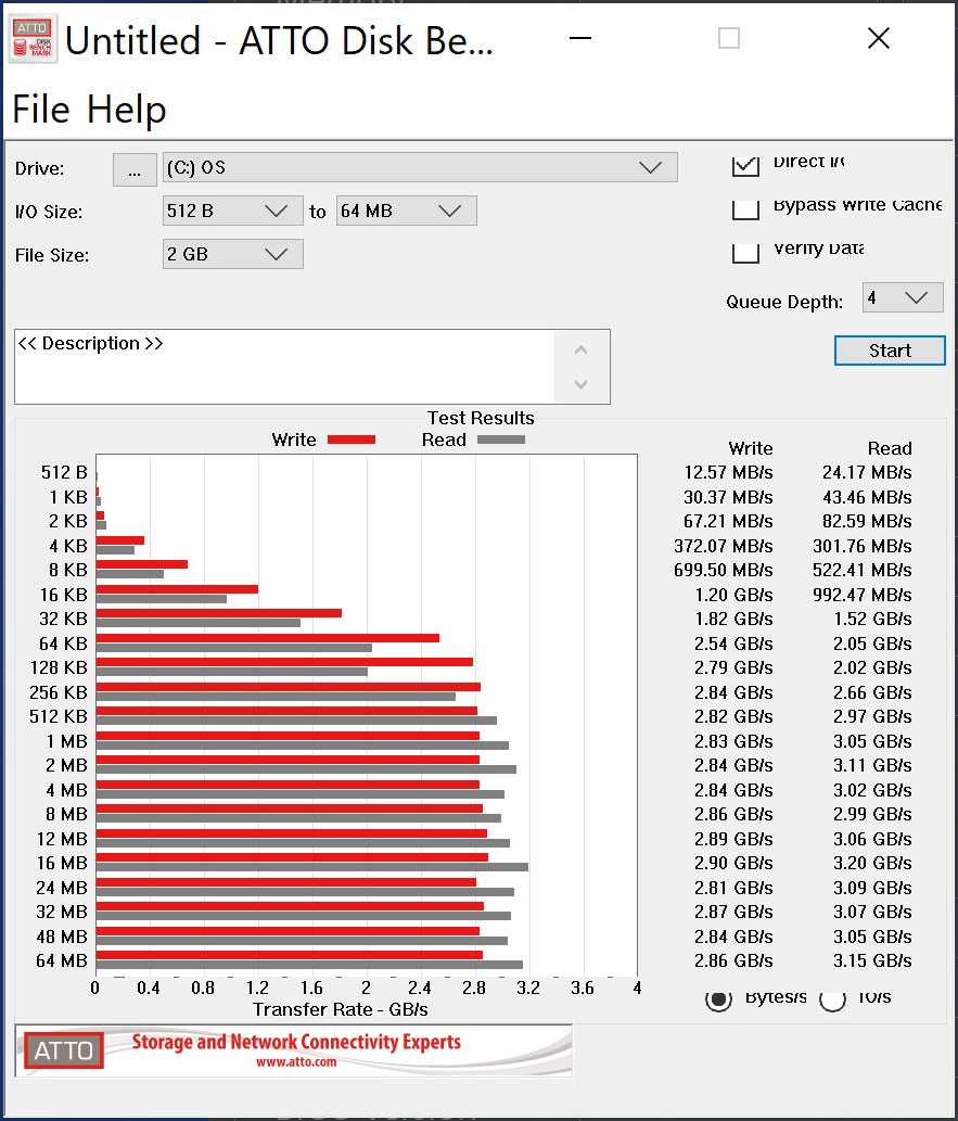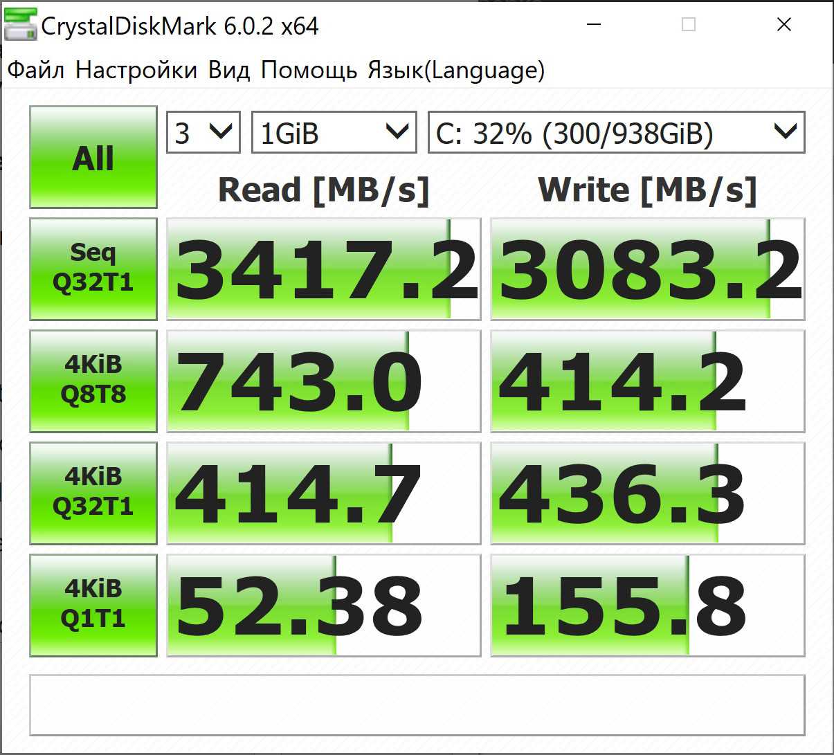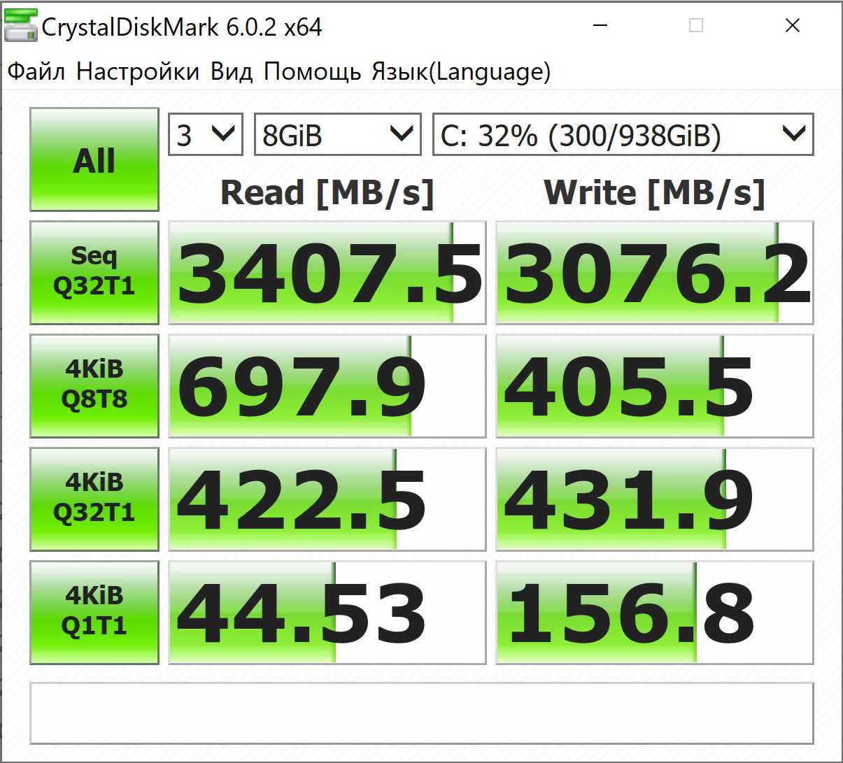 Показатели скорости оказались немного странными: производитель заявляет максимальную скорость чтения 3000 МБ/с и записи 1050 МБ/с. В нашем тестовом образце скорость чтения достигала 3100 МБ/с, а вот записи — только 500 МБ/с, что само по себе неплохо, но далеко от заявленных показателей. Возможно особенности образца: