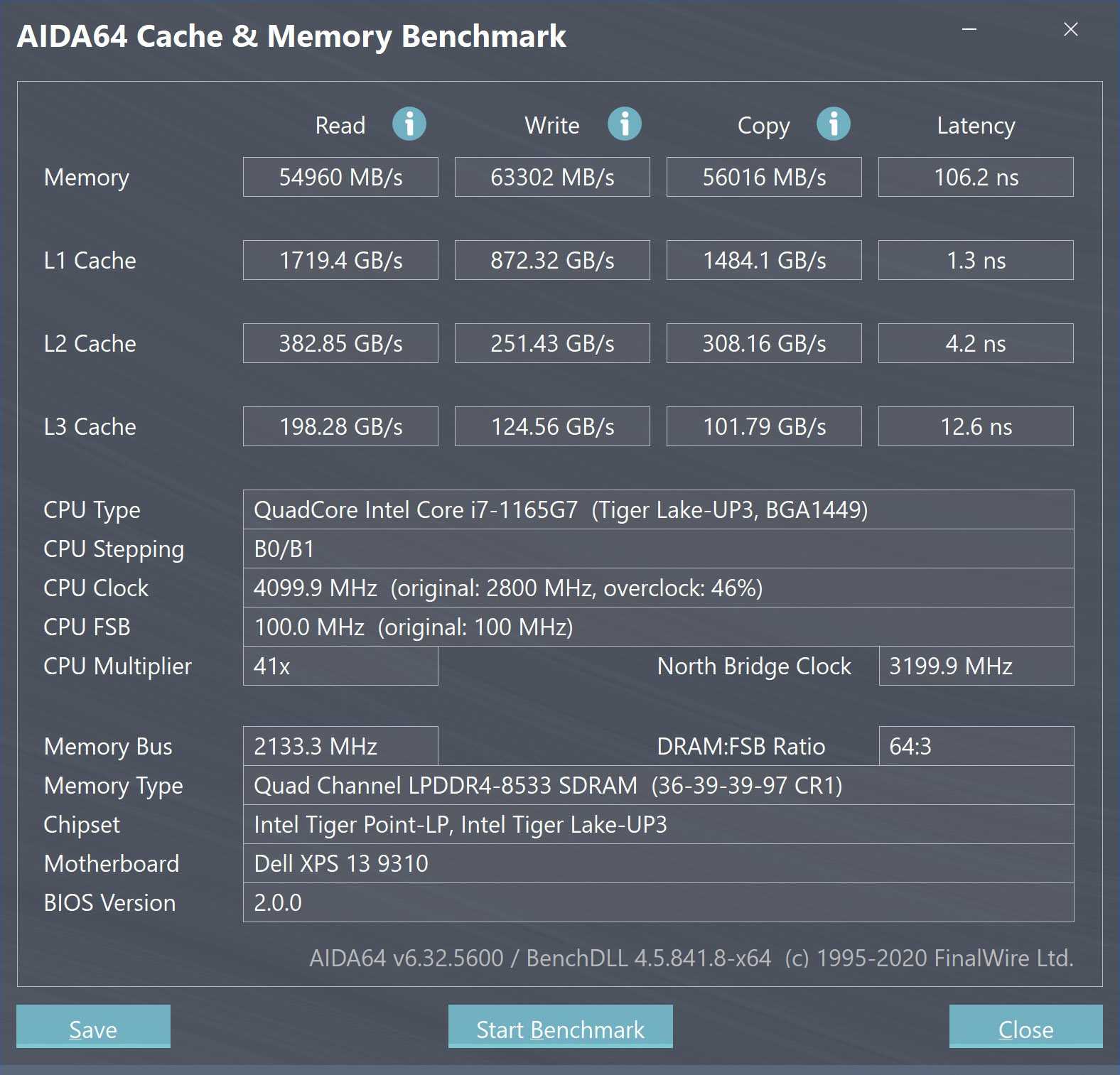 Оперативная память представлена 16 ГБ LPDDR-4, распаянными на материнской плате. Работает она на частоте 4266 МГц в 4-канальном режиме. Тест AIDA64 показал весьма хорошие скорости при не самых низких задержках.