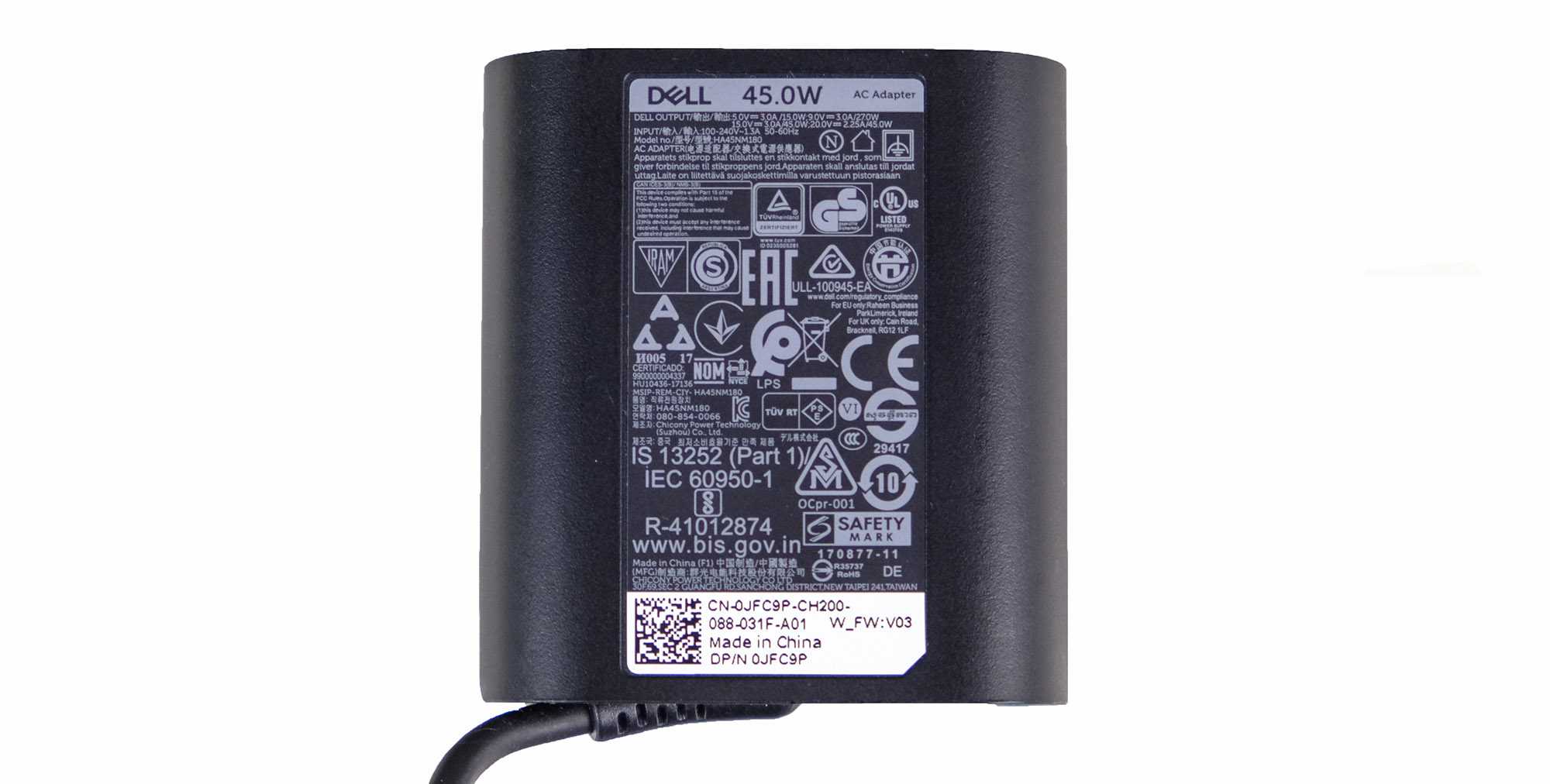 Зарядное устройство в комплекте, подходящее для формата ультрабука – очень миниатюрный блок на 45 Вт весом всего 135 грамм. При напряжении 15 В он обеспечивает ток 3 А и способен зарядить Dell XPS 13 9310 примерно за 2 часа полностью. Есть функция быстрой зарядки, так что первые 70% батарея набирает за первый час.