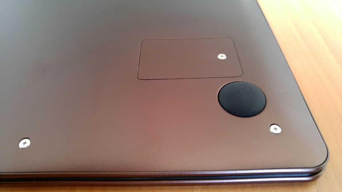 На тыльной стороне основания ноутбука имеются 4 полусферических выступа-опоры. Также, в правой части расположился лючок для установки в ноутбук SSD накопителя формфактора M.2 (SATA SSD 2242) длиной 42 мм.
