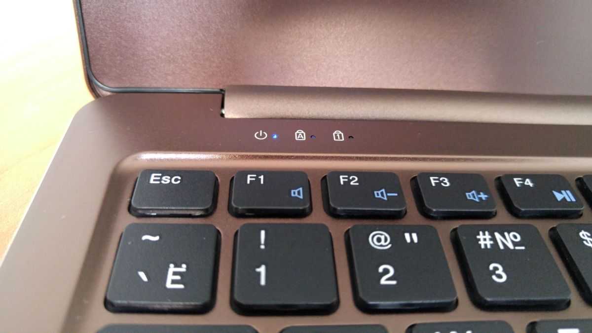 В верхней части слева разместились индикаторы состояния ноутбука и работы встроенного накопителя. Интересно, что индикатора подключенного питания здесь нет. Кнопка включения расположена в правом верхнем углу клавиатуры. Цветом она никак не обозначена, но и нажать ее случайно весьма проблематично.