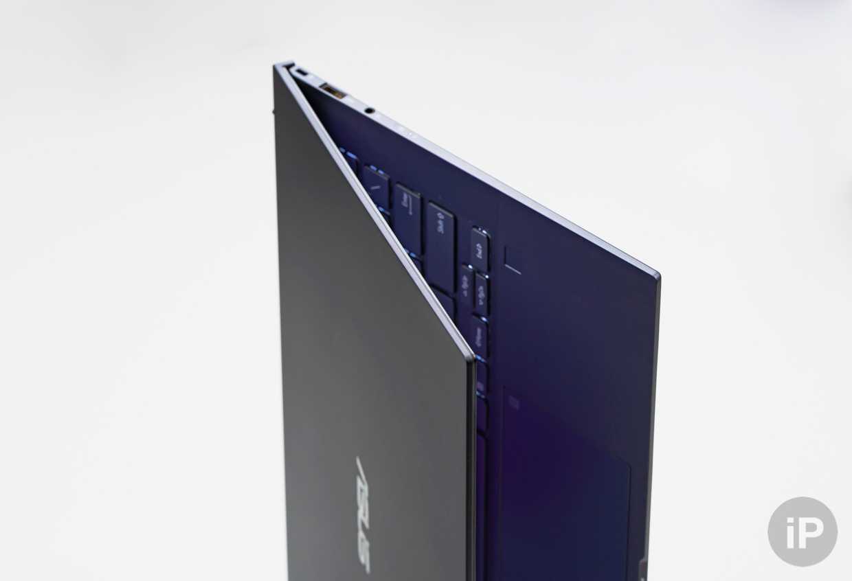 Когда вы откидываете крышку на 90 градусов, она слегка приподнимает корпус. При таком положении ноутбука удобнее печатать, да и системе охлаждения проще работать с дополнительным пространством для вентиляции.