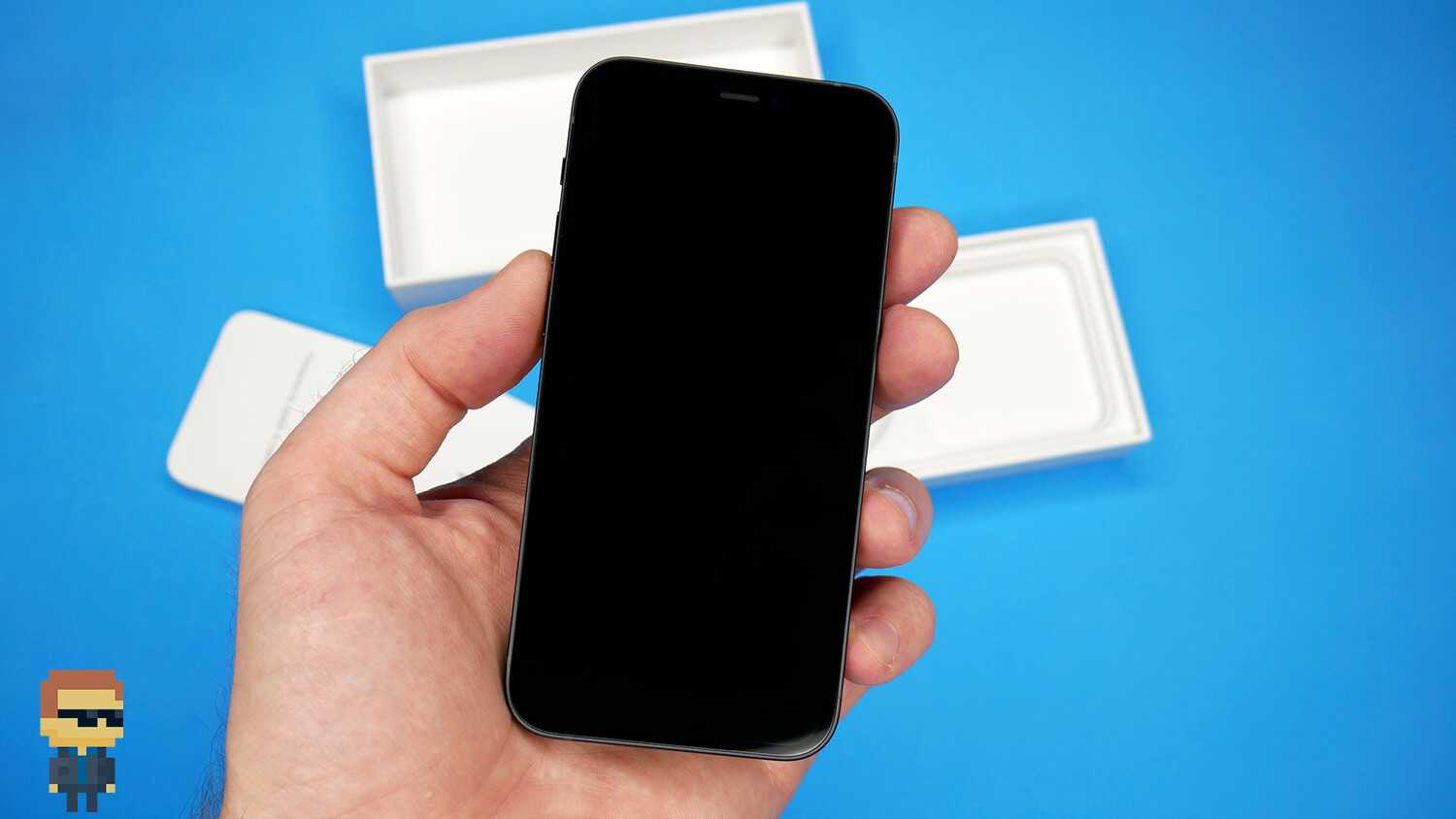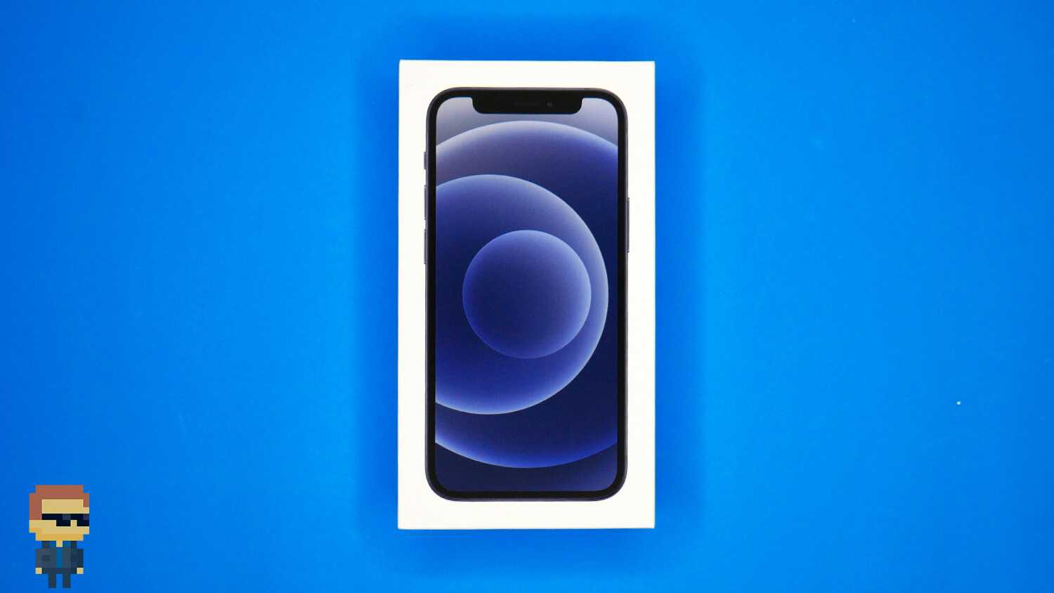 Компактный и мощный флагманский телефон с iOS. На крышке коробки изображено устройство с безрамочным экраном, но явно выраженной «челкой». Нижняя рамка модели самая тонкая в линейке iPhone 12.