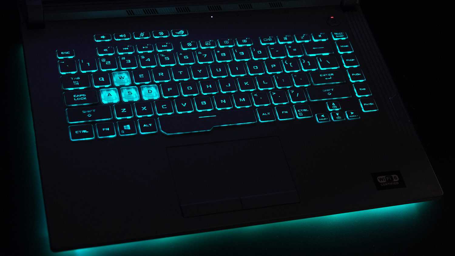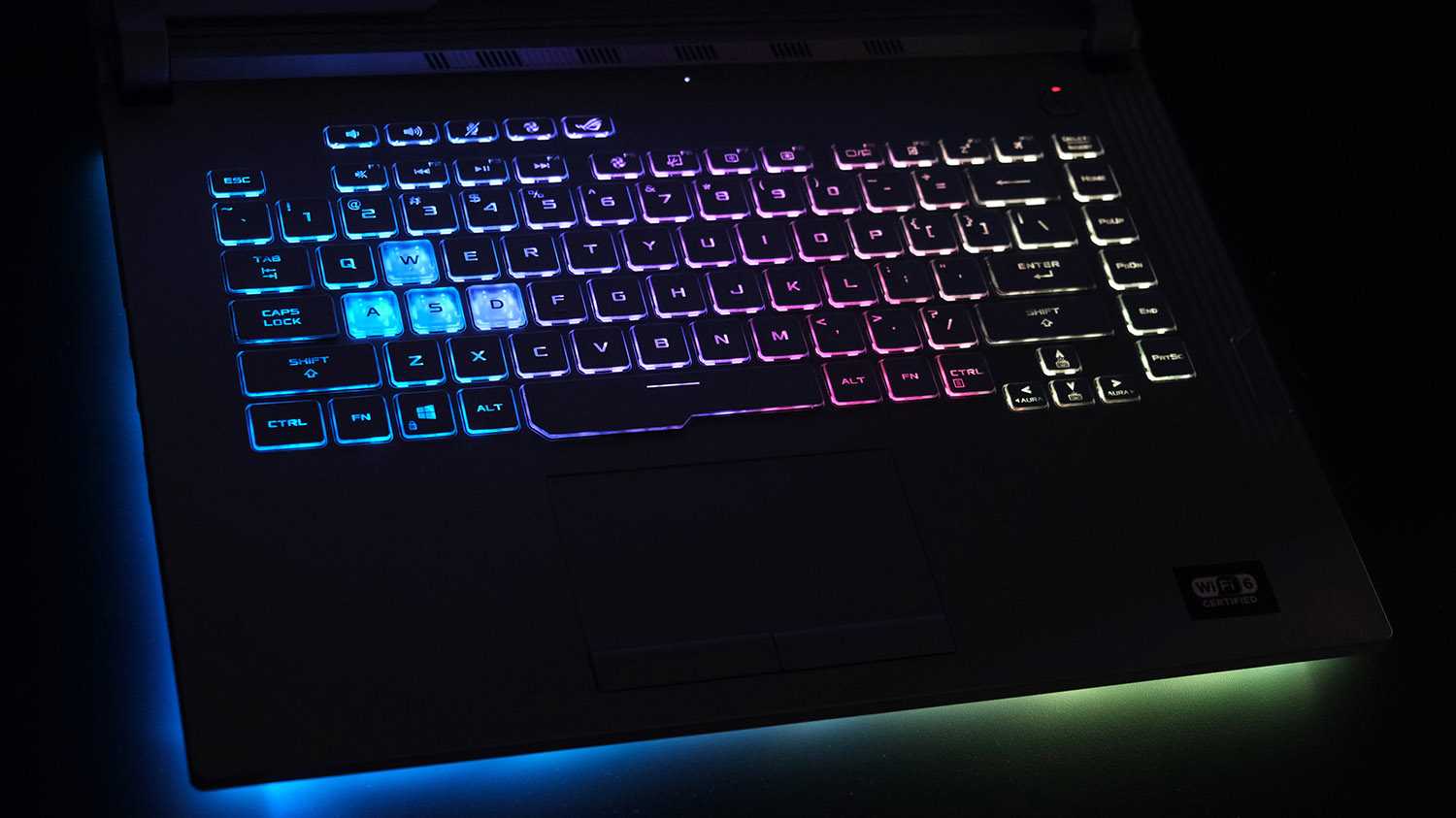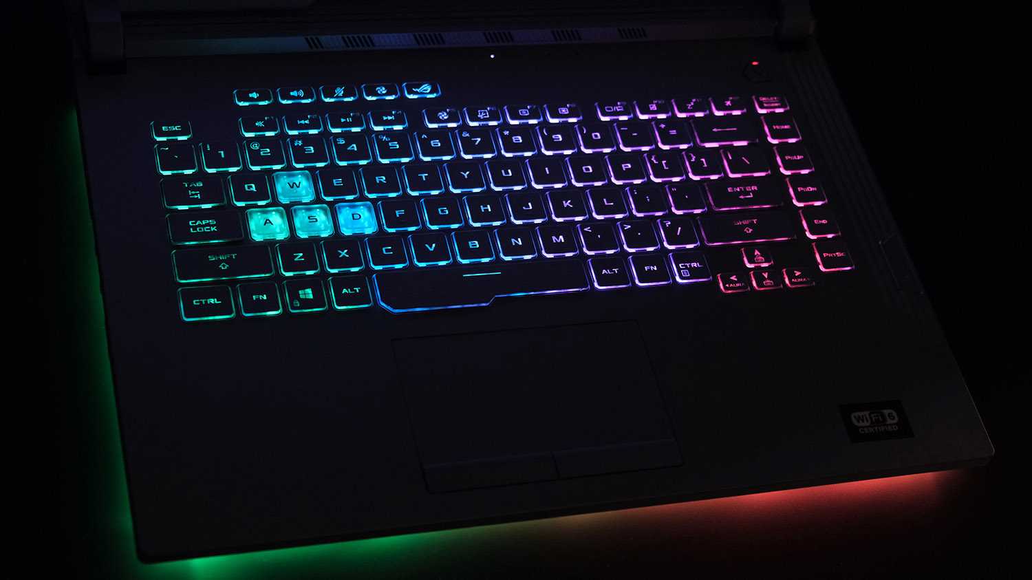 Подсветка у Asus ROG G512L настраивается исключительно при помощи фирменной утилиты Aura и может синхронизироваться с другими подключенными устройствами. По умолчанию доступны несколько популярных режимов и цветовых схем: дыхание, радуга, стробоскоп и т. п.
