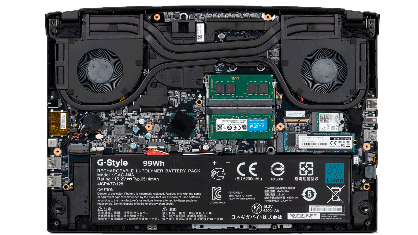 Компоновка пластикового основания почти полностью повторяет оное у Aero 15 OLED, хотя рисунок на вентиляционных решетках большой площади слегка отличается. Снизу ноутбука нет дверцы для быстрого доступа к памяти и накопителям, поэтому для апгрейда придется снимать всю нижнюю панель целиком. Впрочем, проблем с этим не возникнет. Нижняя крышка ноутбука удерживается 12 болтами, два из которых спрятаны под гарантийной наклейкой. Внутри открывается доступ к системе охлаждения, батарее, двум слотам M.2, модулю WiFi и двум слотам оперативной памяти.