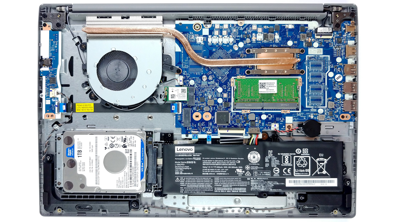 В рассматриваемом Lenovo IdeaPad установлен Pentium Gold 5405U, который был выпущен компанией Intel 23 января 2019 года. Данный процессор предназначен для использования в mobile-компьютерах и построен на архитектуре Whiskey Lake. Процессор заблокирован для оверклокинга. Общее количество ядер составляет 2, потоков — 4. Максимальная тактовая частота процессора — 2.3 ГГц. Что касается оперативной памяти, то в ноутбуке предусмотрен всего лишь один слот, в не установлена планка на 4 ГБ. Дисковая подсистема лэптопа поддерживает установку сразу двух накопителей. В M.2-слот можно установить твердотельный накопитель, он в нашем случае не занят. хранение данных осуществляется на 1 ТБ HDD WD10SPZX.