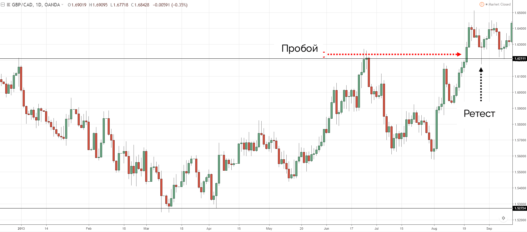 - Рынок пробил сопротивление и совершает откат к уровню пробоя (где предыдущее сопротивление могло стать поддержкой).