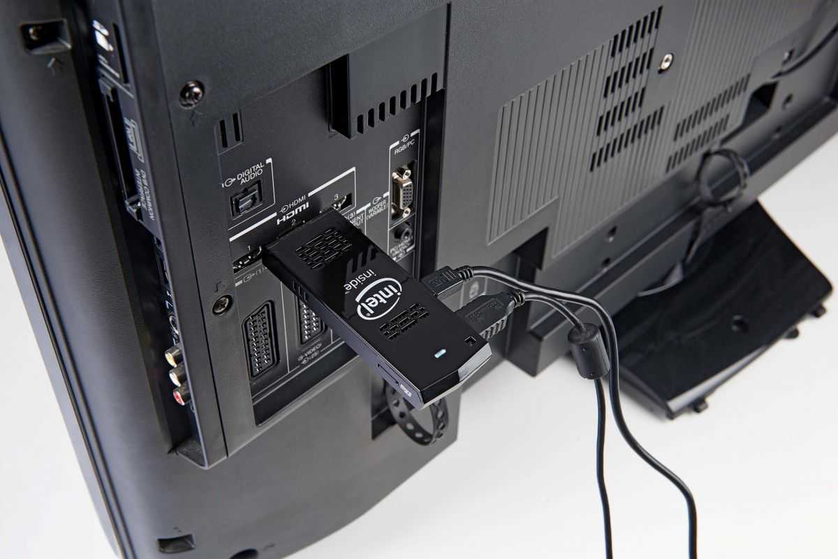 Для обеспечения устройства Compute Stick электропитанием мы подключили его кабелем (входящим в комплект поставки) к USB-разъему телевизора; однако для дальнейшей стабильной работы тока от USB-порта недостаточно. Только благодаря источнику питания на 2 А (также входит в поставку) мы получили достаточно энергии для включения устройства.