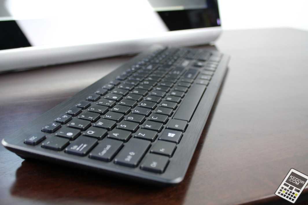 Полноразмерная клавиатура тоже весьма удобна и, в большинстве случаев, будет полностью удовлетворительна для всех, кроме игроков. В боевых условиях клавиши не всегда вовремя реагируют, тут сказывается то, что она беспроводная. Дизайн клавиатуры немного отличается от дизайна компьютера: ее корпус глянцевый снизу (где этого никто не видит) и матовый сверху, отделан горизонтальными линиями, создающими эффект «под дерево». Кнопки гладкие, матовые, и к их раскладке тоже сложно придраться, только они уж больно шаткие и громкие с большим ходом. Есть несколько медийных кнопок управления воспроизведением и кнопка Mute. С одной стороны, не нужно ждать чего-то выдающегося от комплектной клавиатуры, но, с другой стороны, за эти деньги она могла бы быть и лучше.