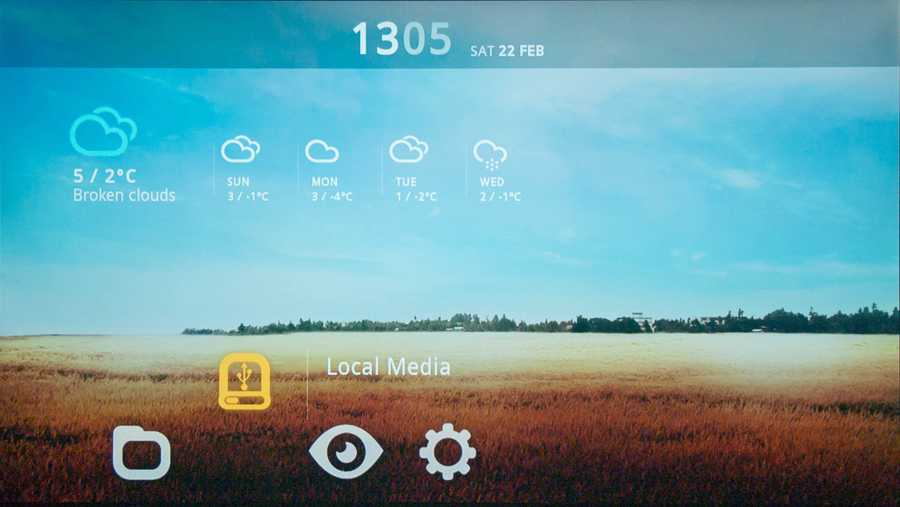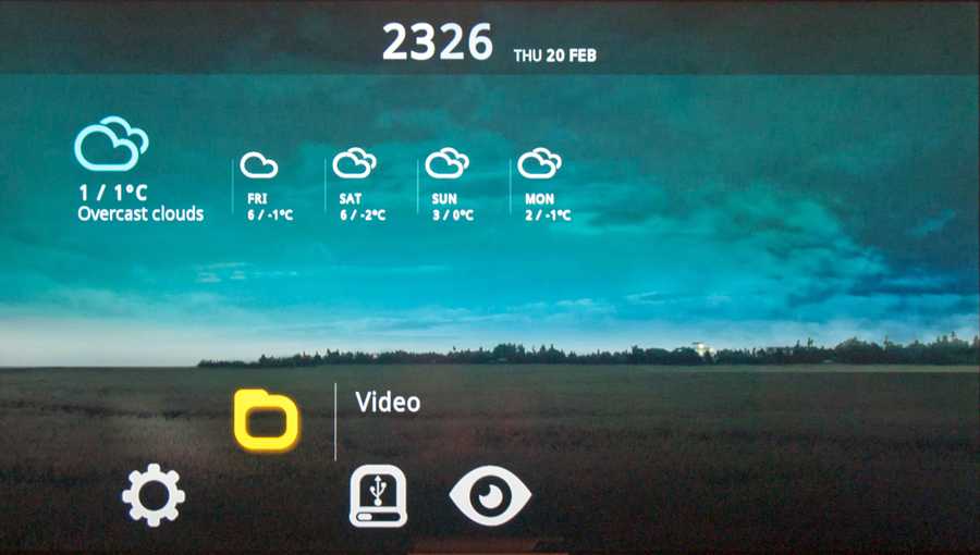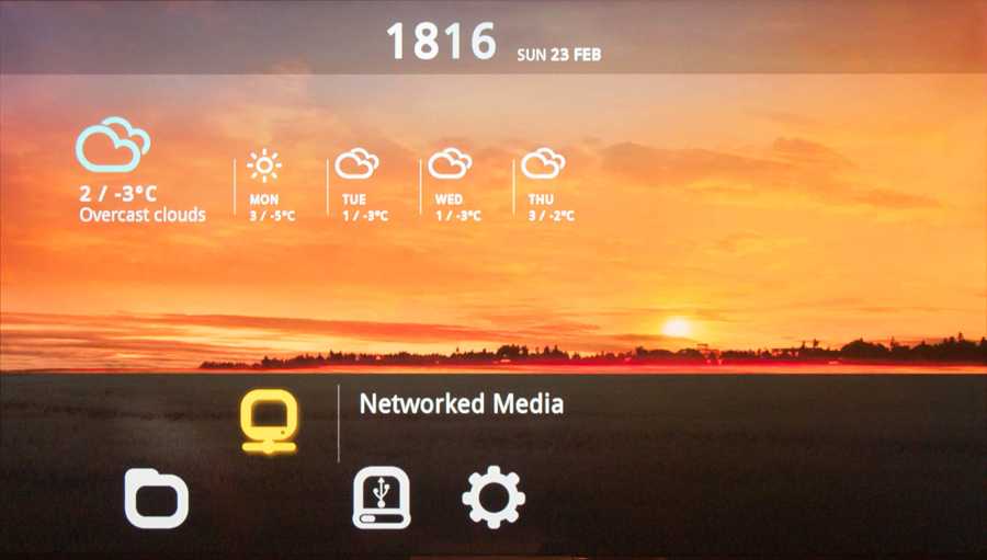 Фон главного экрана – «активный», автоматически меняется в зависимости от времени суток и погоды за окном, выглядит это действительно весьма эффектно (но при желании пользователь может заменить фоновое изображение своим собственным, если стандартное его не устраивает). В нижней части в виде скроллируемой ленты выводятся пункты главного меню, вверху экрана показывается текущее время и прогноз погоды (для этого в настройках необходимо указать свое местоположение, заодно можно выбрать формат прогноза – на сегодня или на ближайшие 3/5 дней).