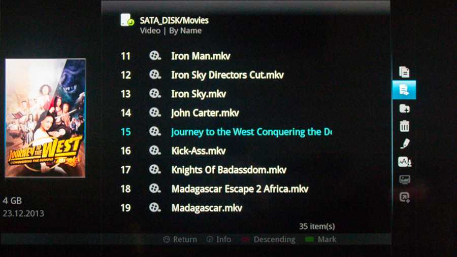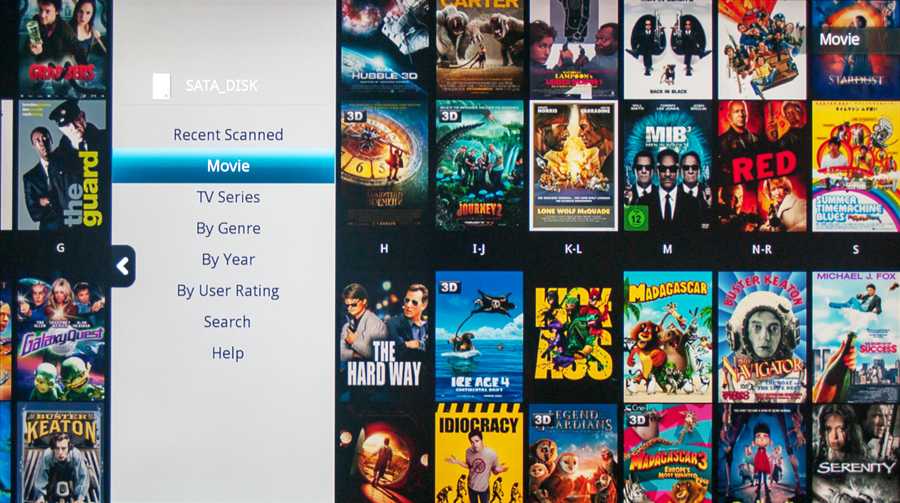В списке видеофайлов доступны два меню – операций с файлами (копирование/перемещение/удаление, создание папки и т.д.) и перехода в режим полноценного «медиацентра» — Networked Media Jukebox, или NMJ (если он будет основным режимом использования плеера, в системных настройках можно включить автоматический запуск NMJ при включении). Здесь вся видеотека представлена в виде «стены» обложек фильмов, которые можно упорядочивать по алфавиту, жанру, году выхода, пользовательскому рейтингу. Также имеется отдельный режим для телесериалов – с делением на сезоны, возможностью выбора отдельного эпизода и т.д.