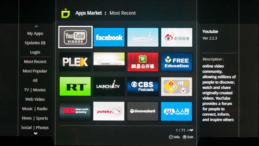 Стандартный состав главного меню: Networked Media (доступ к сетевому окружению), Apps Market (собственный магазин приложений, с наполнением у которого, впрочем, до сих пор не очень хорошо, к тому же в нем нет локальных ресурсов, востребованных у отечественного пользователя). Local Media (подключенные к плееру накопители и внутренний жесткий диск), Recently Played (список недавно просмотренного видео), Shortcut (папка со ссылками – своего рода Избранное; ссылки при этом можно добавлять не только в эту папку, но и в собственно главное меню), Setup (системные настройки) и Setup Wizard (мастер первоначальной настройки).