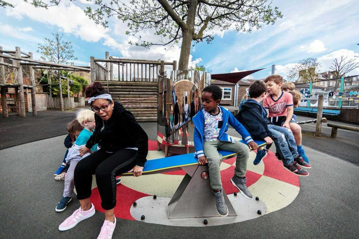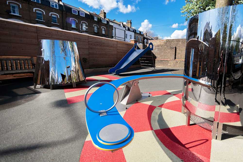 Детская площадка при научной лаборатории школы Элеоноры Палмер в Кентиш-Тауне (Лондон). Архитекторы студии Unit Lab расставили по периметру игровой зоны цилиндрические зеркала. Если смотреть в выпуклые фигуры, то концентрические красно-белые круги на асфальте превращаются в ровную шахматную сетку, а отражения детей искажаются, что позволяет разбавить образовательный процесс весельем.