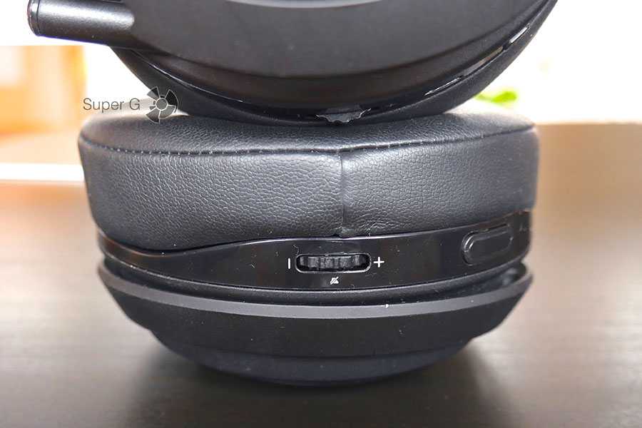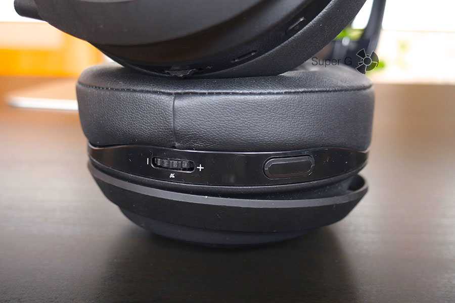 Среди вынесенных элементов имеются регулятор громкости микрофона, порт Micro USB, кнопка включения на левой чаше и регулятор громкости с отверстием для USB-адаптера на правой.