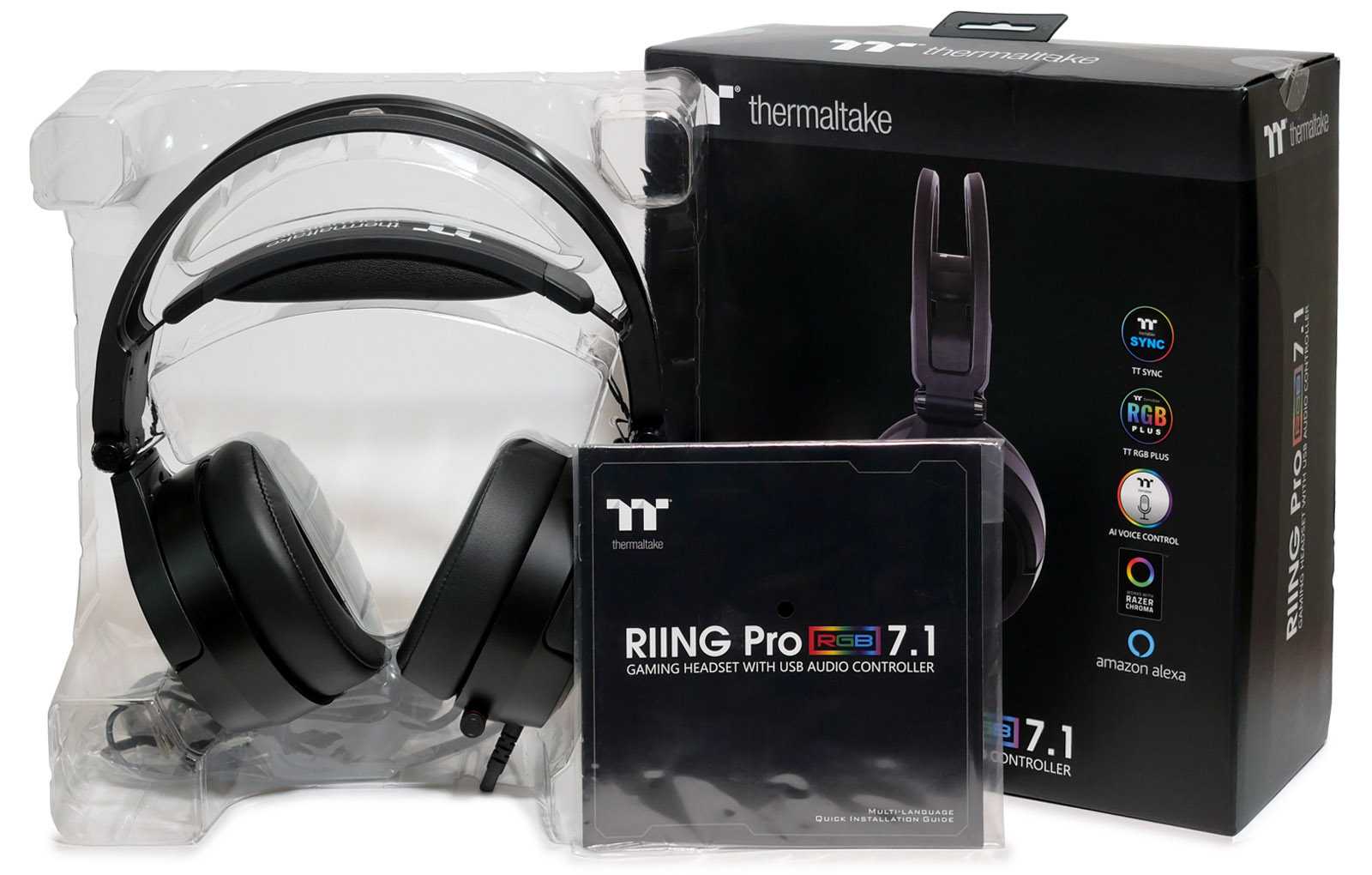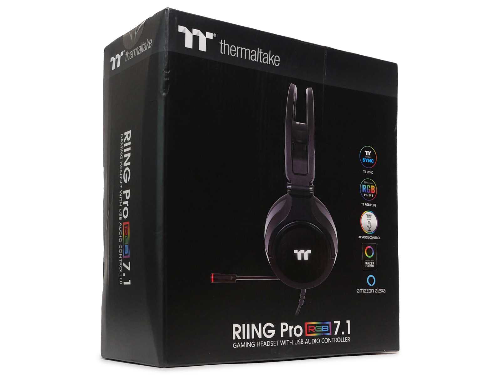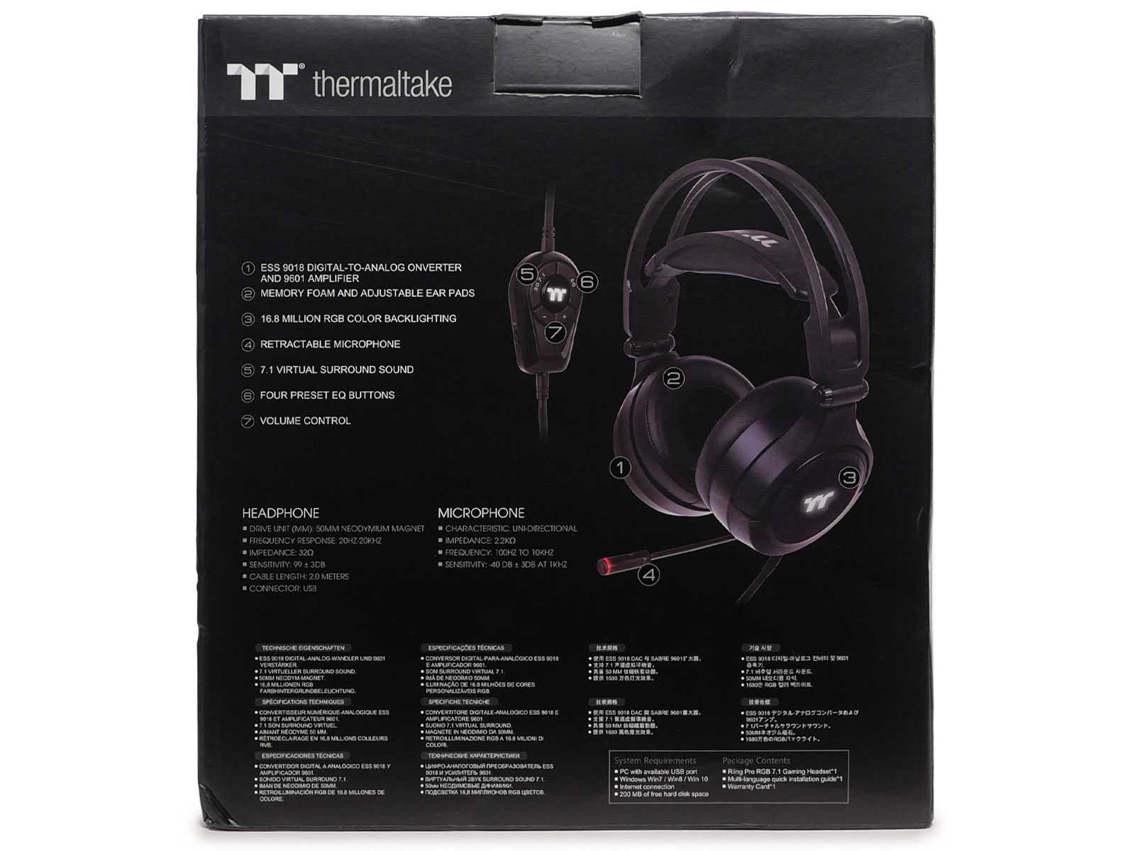 Упаковка игровой гарнитуры имеет габариты 26,2 (В) х 23,8 (Ш) х 10,8 (Г) см. Оформление сделано в цветах, свойственных топовой продукции под логотипом TT Premium, с преобладанием чёрного и тёмно-серого. Получилось стильно, но немного мрачновато.