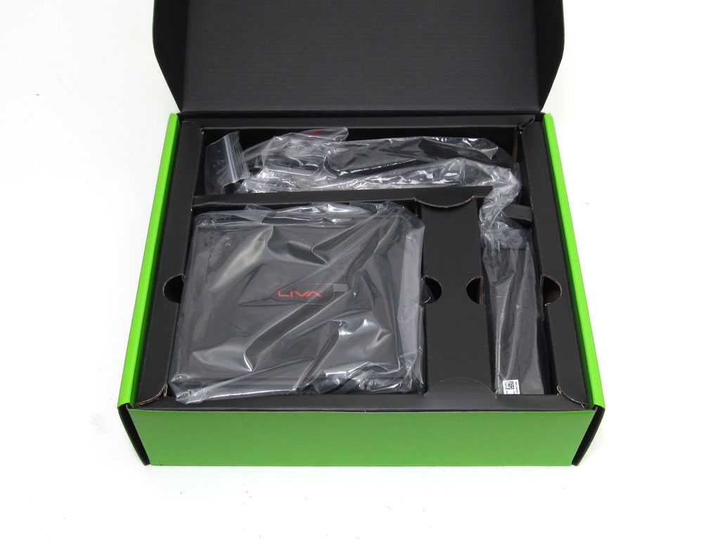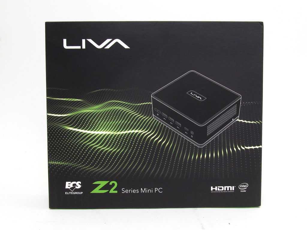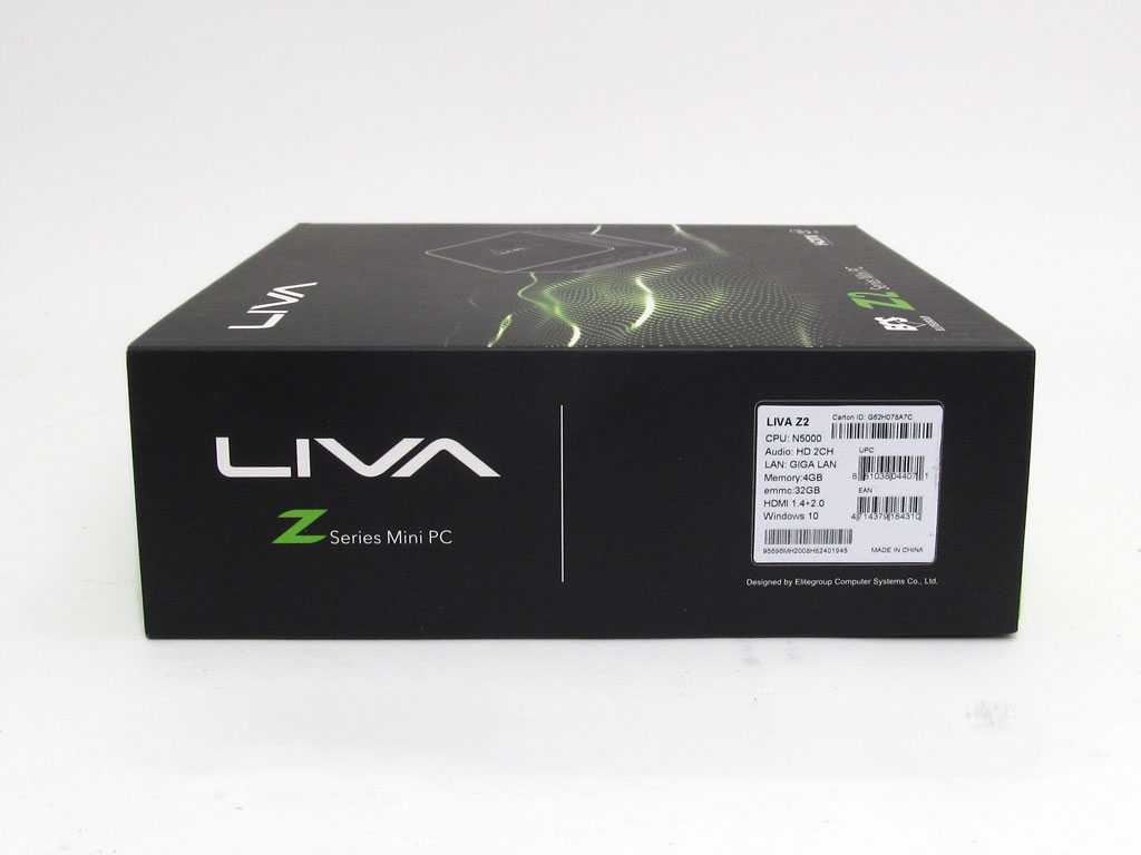 LIVA Z2 поставляется в зеленой коробке, длина которой составляет примерно 27,9 см, ширина 22 см и толщина 7,5 см. В верхней части отображаются название системы и продукта, а также расположено несколько логотипов. Между тем, дно полностью черное с фирменным наименованием LIVA. На упаковке действительно мало что можно увидеть.