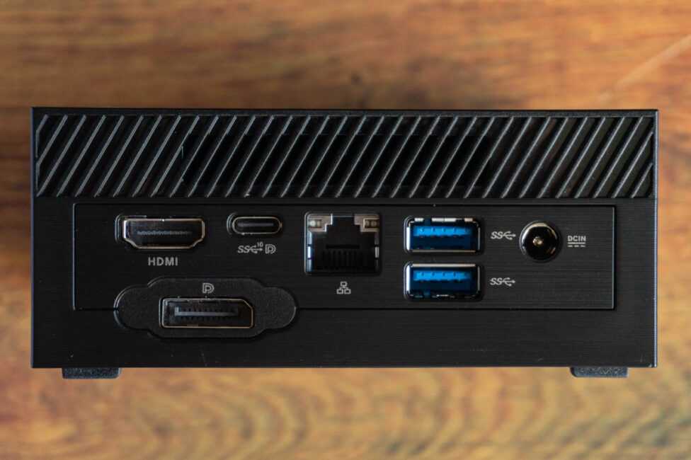 Сзади в свою очередь помимо прорези системы охлаждения видим: разъем HDMI, второй USB 3.1 Gen 2 Type-C но уже только с поддержкой вывода изображения DisplayPort (без быстрой зарядки), сетевой порт RJ-45, пара USB 3.1 Gen 1 Type-A и разъем подключения питания.