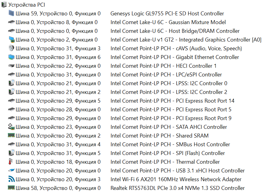 Общий список подключенных устройств – гигабитный сетевой контроллер реализован на базе микросхемы Intel I219-V, за работу беспроводных сетей (Wi-Fi, Bluetooth) отвечает Intel Wi-Fi 6 AX201.