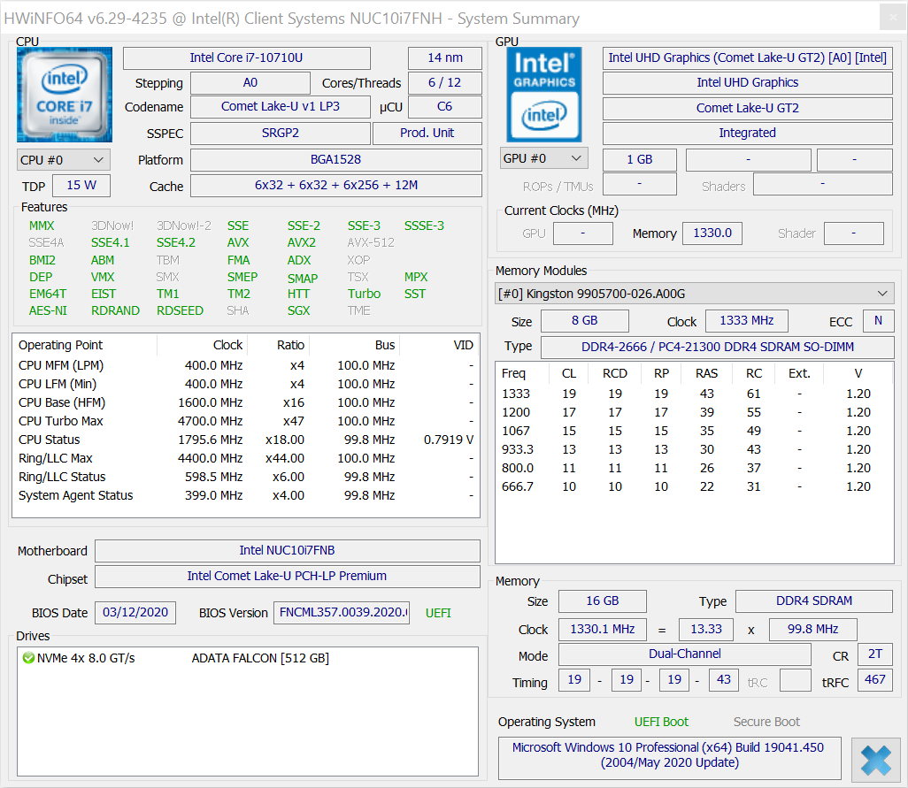 Основная информация по компонентам Intel BXNUC10i7FNH2 в диагностической утилите HWInfo64.