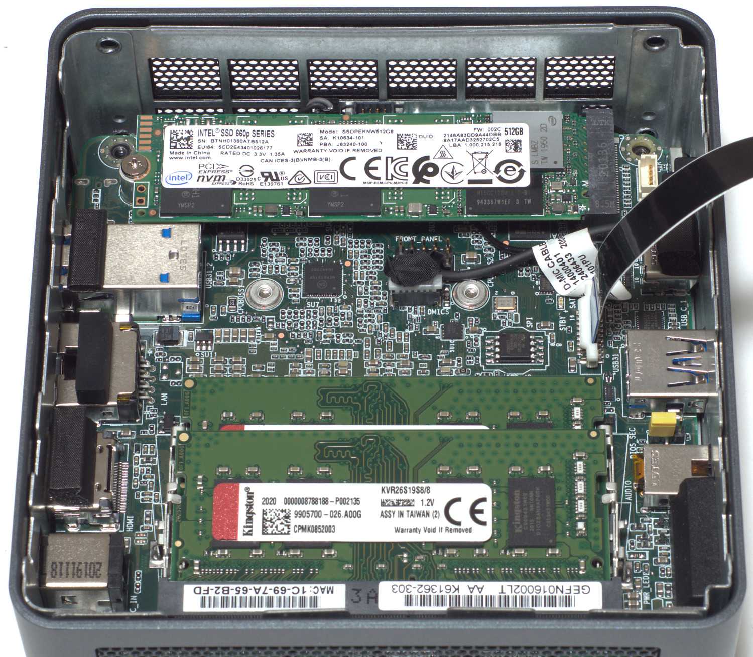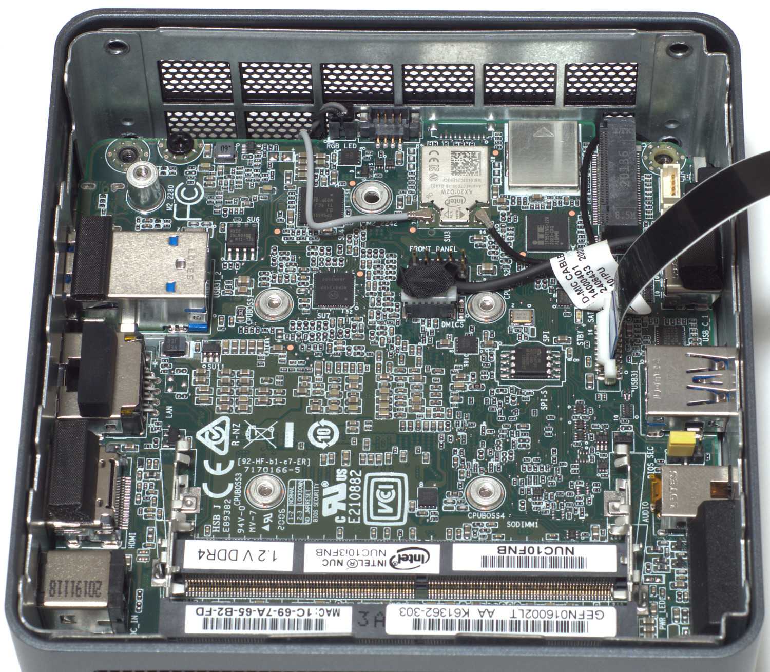 Внутри корпуса находится системная плата Intel Frost Canyon NUC10i3FNH (форм-фактор UCFF, размеры — 100 мм х 100 мм), вверху которой размещен непосредственно впаянный процессор Intel Core i3 10110U (2.1-4.1 ГГц), батарейка, а с обратной производится доступ к установке двух модулей оперативной памяти SO-DIMM DDR4 до 2666 МГц (максимальный объем 2х32 Гбайта) и накопителя M.2 2242/2280 SATA/NVMe (толщина накопителя до 7 мм). Такое размещение обеспечивает равномерный нагрев компонент внутри. Здесь же присутствует контроллер Intel Wi-Fi 6 AX201, обеспечивающий работу беспроводных сетей Wi-Fi 802.11a/b/g/n/ac/ax и Bluetooth 5, ИК-порт.