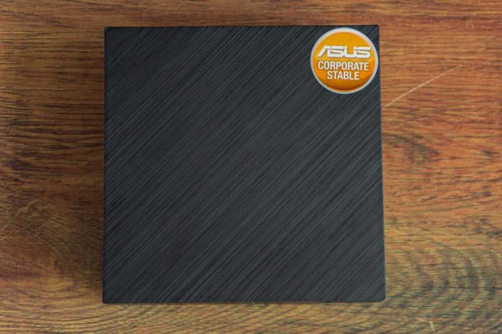 Сверху — нет ничего кроме уже упомянутой текстуры, которая здесь направлена диагонально, и стикера ASUS Corporate Stable Model. Последний подразумевает 36 месячную гарантийную поддержку продукта и бесплатный программный комплекс ASUS Control Center для администрирования.