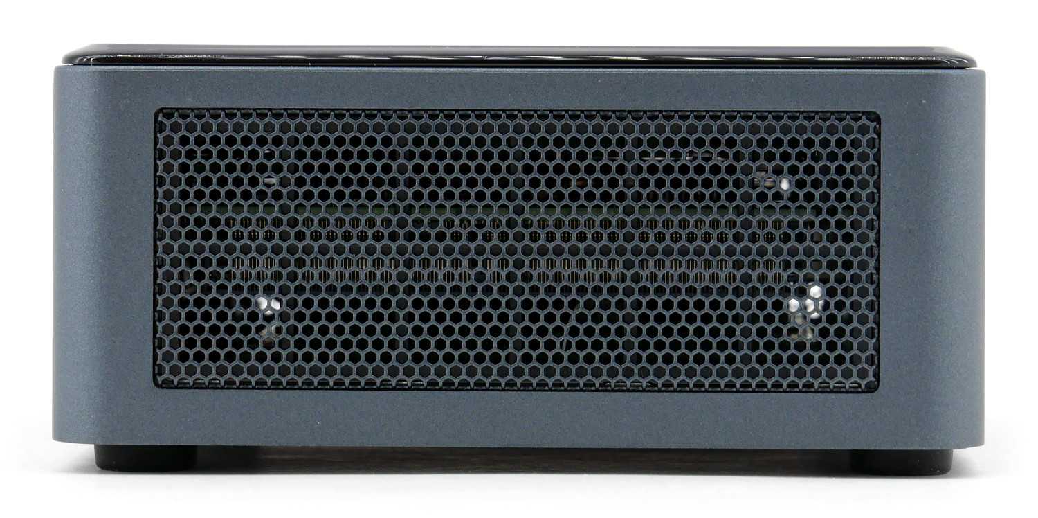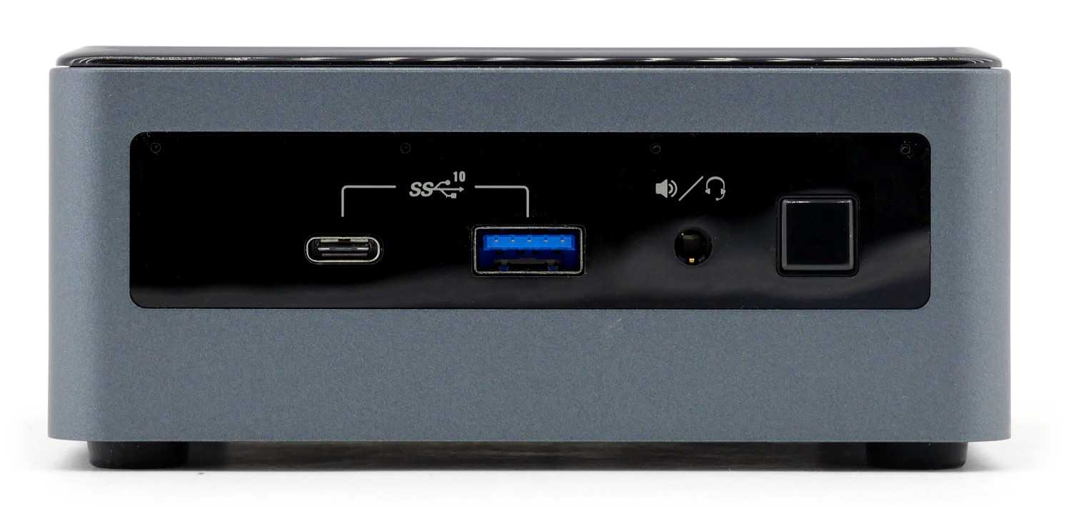 Корпус Intel NUC выделяется простотой, минималистичностью и симметричностью. В нашем случае модель Intel BXNUC10i7FNH2 имеет классическую серо-черную расцветку и приятный сдержанный дизайн, который идеально вписывается в практически любой интерьер и рабочую обстановку. Передняя лицевая панель предлагает кнопку включения с синей подсветкой логотипа, два порта USB 3.1 Gen2 стандартного типа А и унифицированного Type-C, комбинированный аналоговый разъем 3.5 мм для микрофона/наушников.