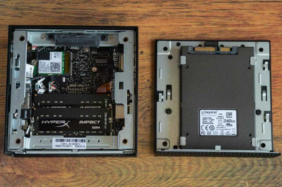 Фактически, чтобы начать работать требуется доукомплектовать мини-ПК оперативной памятью, накопителем и установить операционную систему. Мы использовали модули памяти 2х8 Гбайт с частотой 2666 МГц Kingston KVR26S19S8/8, M.2 накопитель Intel SSD 660p объемом 512 Гбайт (SSDPEKNW512G8).