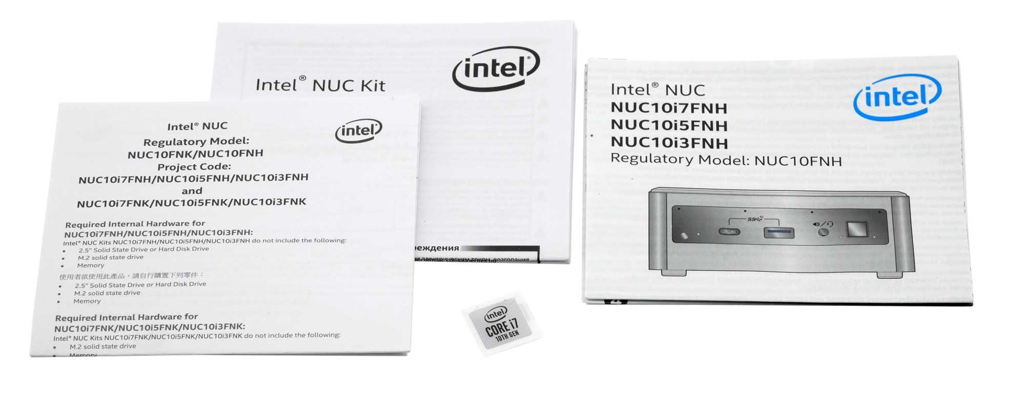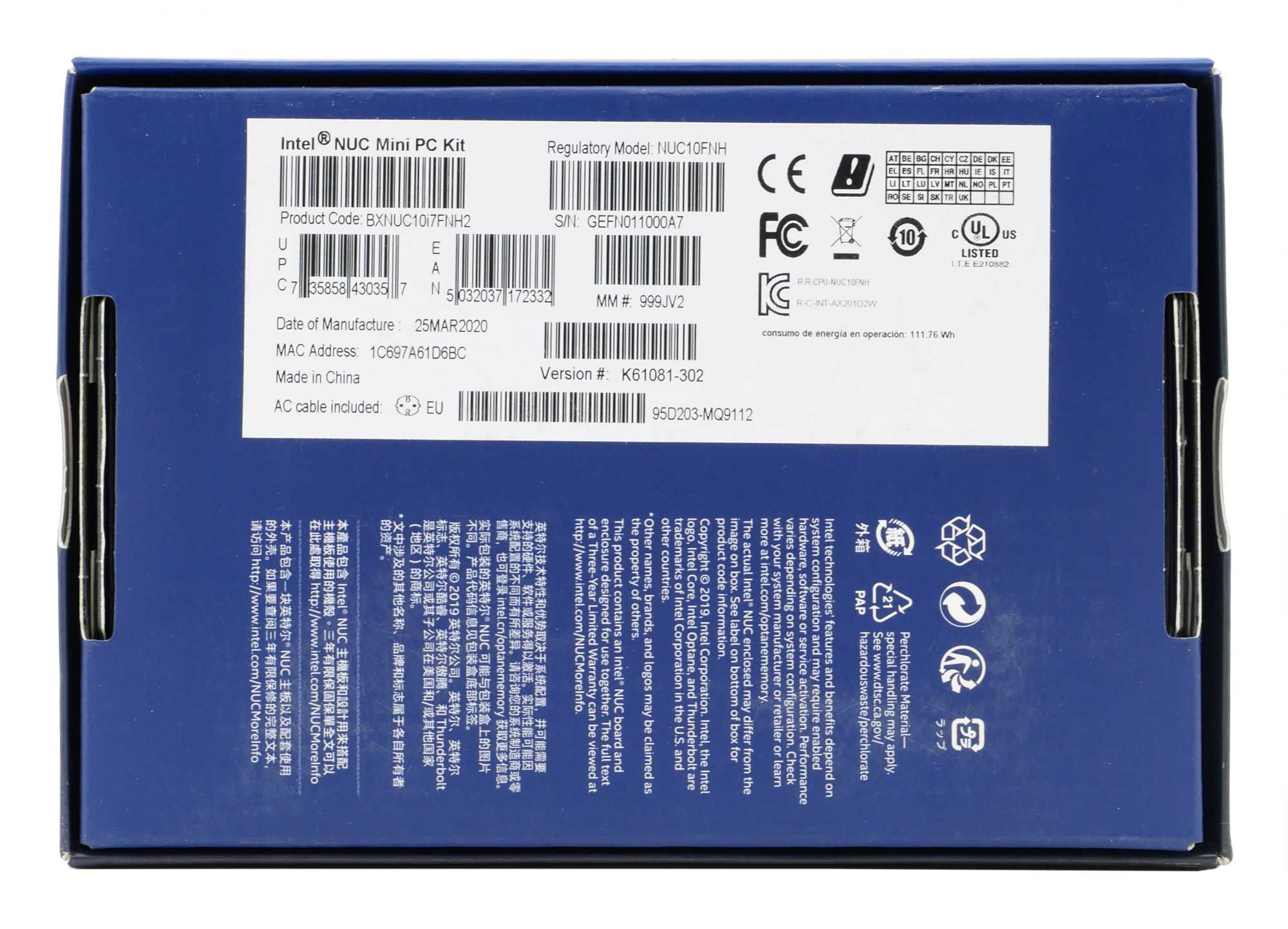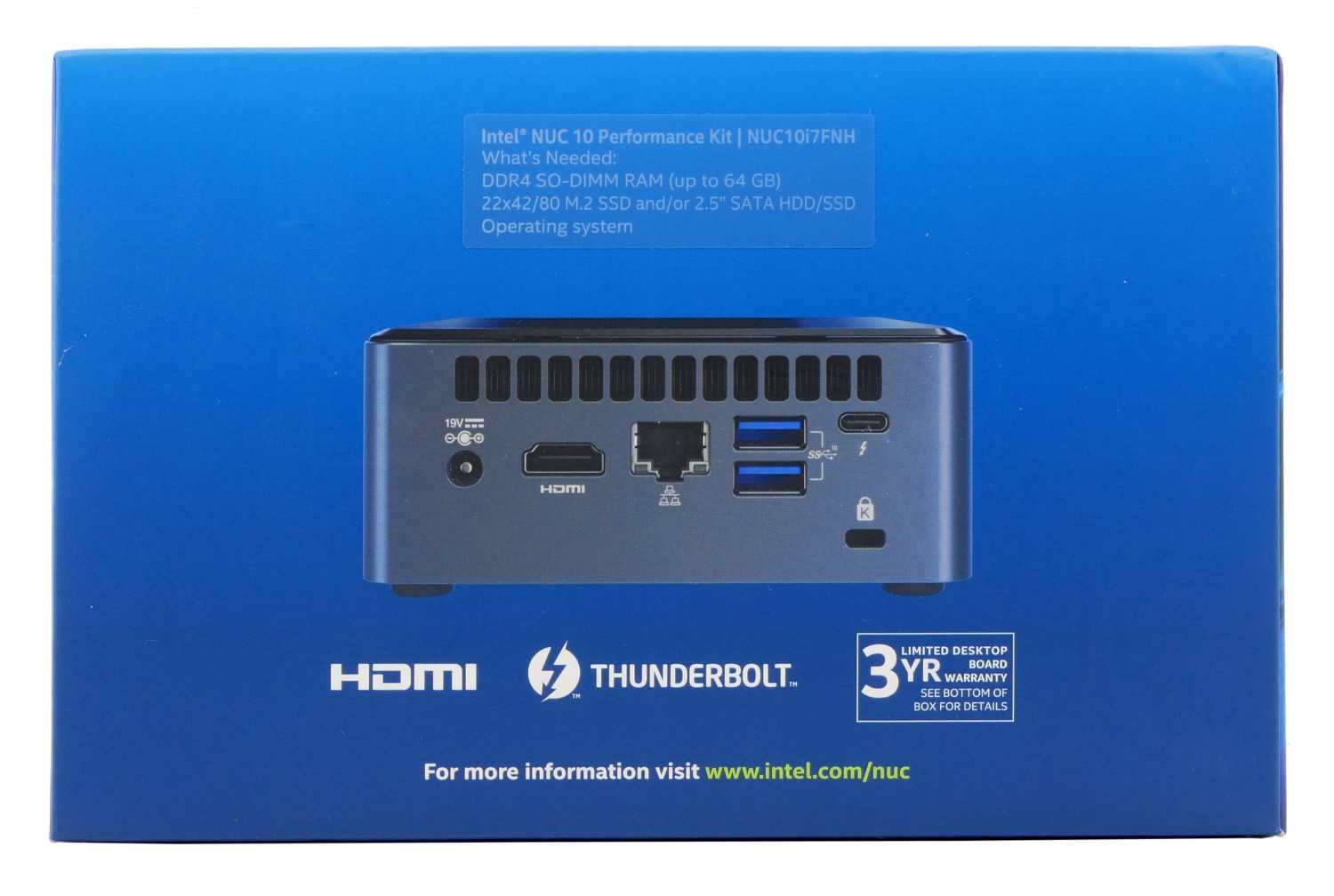 С другой стороны расположилась интерфейсная часть мини-ПК Intel BXNUC10i7FNH2 и специальный стикер, который сообщает, что для полноценной работы необходимо доустановить оперативную память стандарта DDR4 SO-DIMM, накопители формата M.2 2242/2280 и/или устройство хранения 2,5-дюйма. Чуть не забыли про операционную систему — рекомендуется Windows 10 x64, образ которой можно скачать с официального сайта Microsoft.