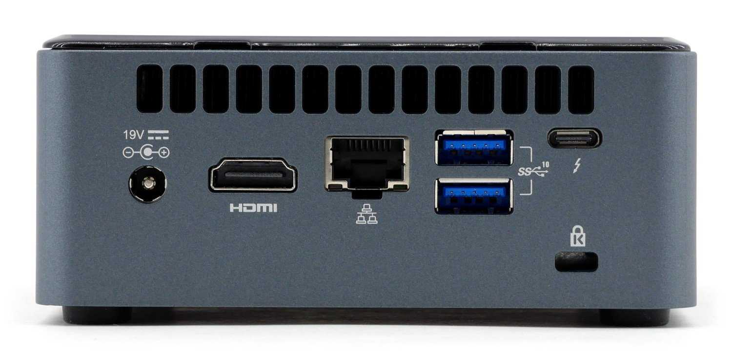 Основной набор интерфейсов располагается на задней стороне платформы Intel BXNUC10i7FNH2. Пользователю доступны два порта USB 3.1 Gen2 (тип А), гигабитный сетевой порт LAN, видеовыход HDMI 2.0a для подключения монитора, комбинированный порт Thunderbolt 3/DisplayPort 1.2