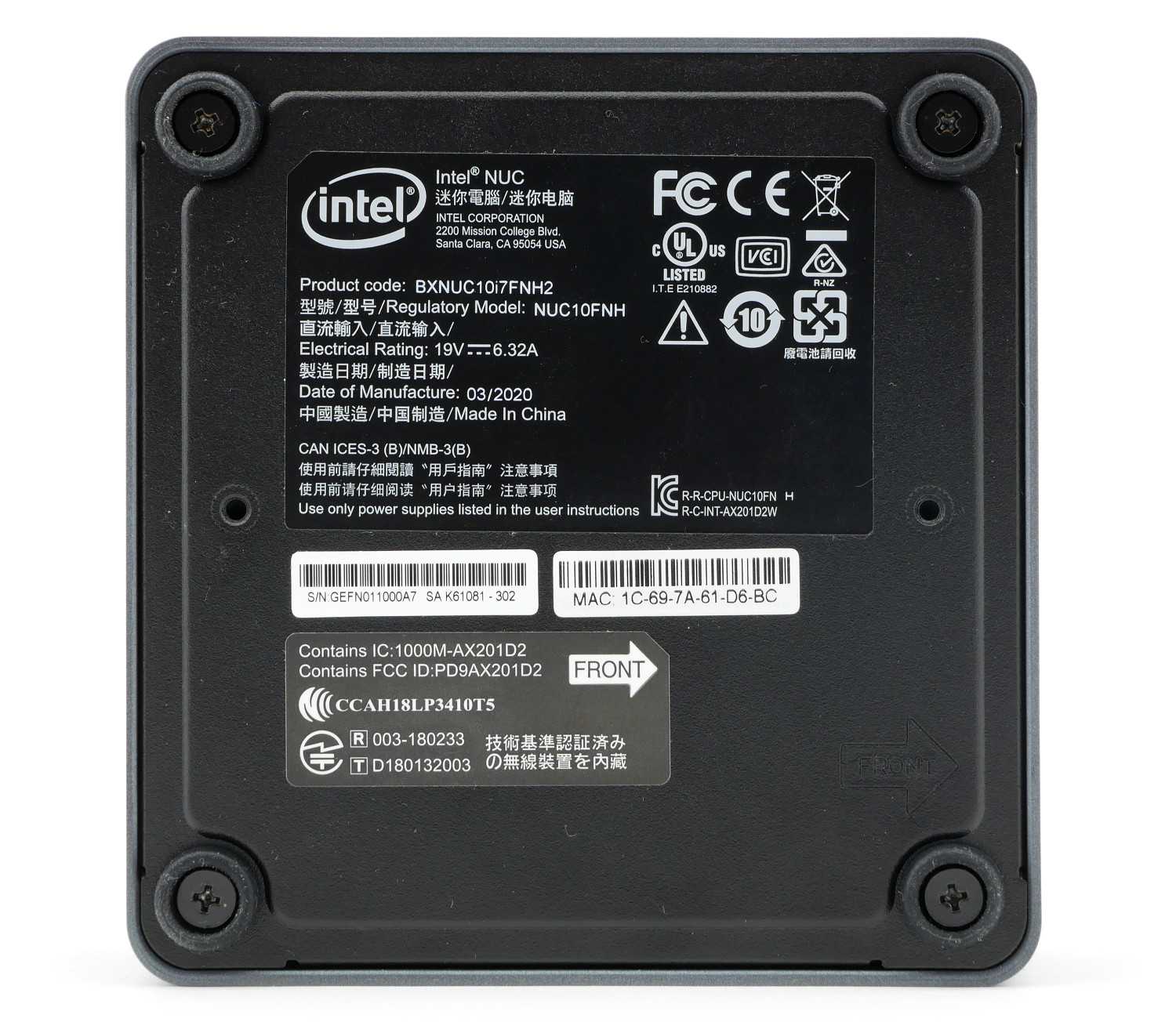 Для устойчивости на любом типе поверхности на основании Intel NUC располагаются четыре опорные точки с прорезиненными вставками. Информационная наклейка раскрывает наименование кода продукта, регистрационный номер, характеристики источника питания, дату производства и страну-изготовителя.