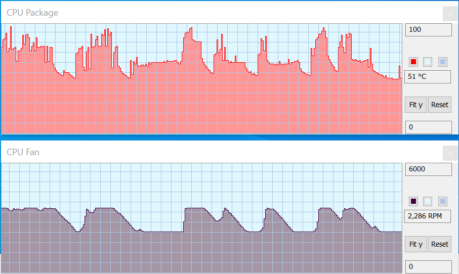 Поведение процессора Intel Core i7-10710U с максимальной нагрузкой и прямой зависомостью кривой вентилятора: последний резко взывает, далее равномерно понижает скорость вращения.