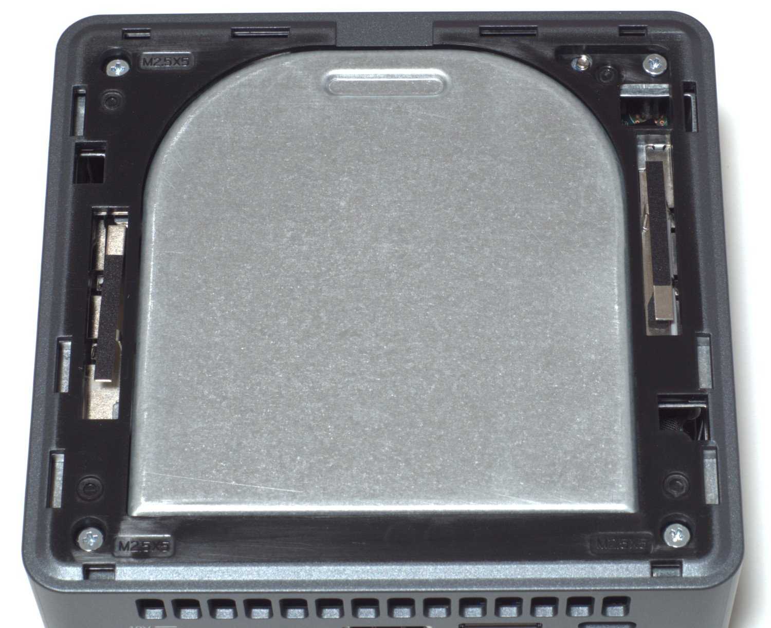 Верхняя пластиковая крышка у мини-ПК Intel BXNUC10I3FNH2 позволяет увидеть металлическую крышку системы охлаждения ноутбучного типа (небольшой радиатор с тепловыми трубками и вентилятором) и получить доступ к 4-м винтам, фиксирующим металлический каркас корпуса.