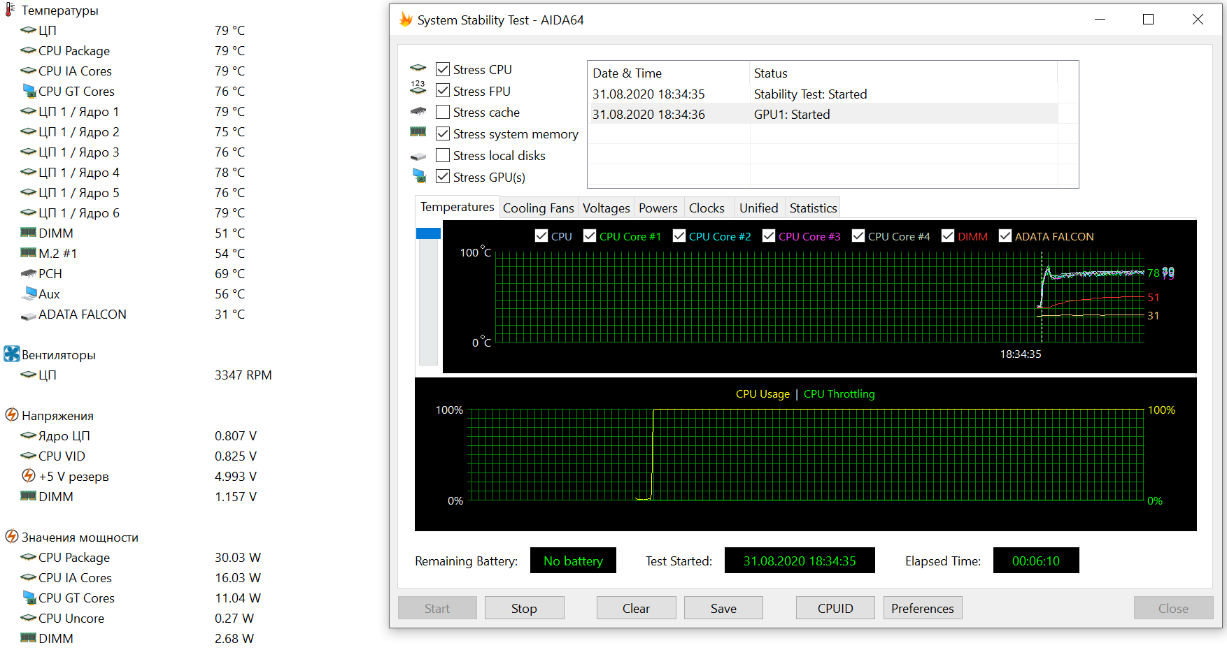 Пиковая максимальная нагрузка достигается в стресс-тесте AIDA64, но процессор быстро переходит к троттлингу для сдерживания потребления и нагрева. Кулер раскручивается до 3400 об/мин при заметном, но не мешающем уровне шума.