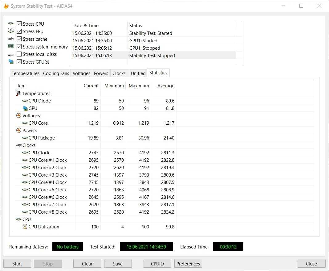 Также в BIOS ASUS Mini PC PN50 есть несколько режимов работы системы охлаждения: тихий, нормальный и производительный. На практике оказалось, что эти режимы практически не влияют на уровень производительности либо нагрева ЦП. Те незначительные отличия фактически на уровне погрешности — в галерее ниже есть три получасовых теста стабильности из AIDA64 во всех режимах. Частота процессора находилась в среднем на уровне 2,8 ГГц, а та же средняя температура не превышала 89,6°.